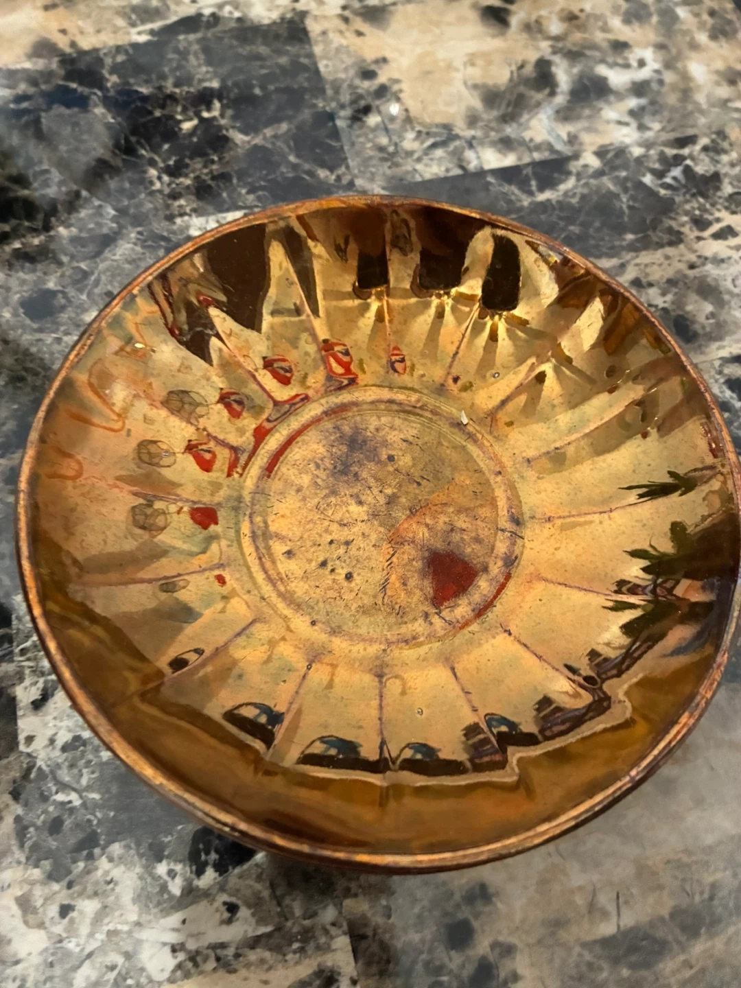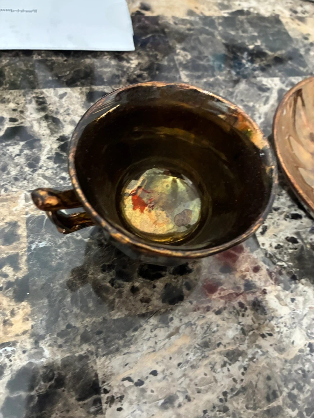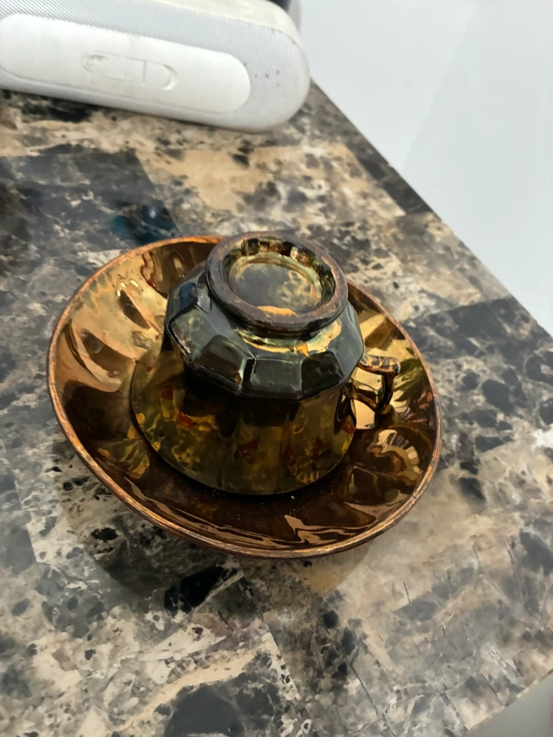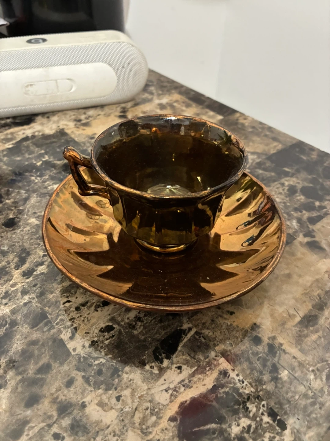 Selling a copper luster cup and saucer set. It has a unique design and would be a great addition to any collection or for enjoying a cup of tea