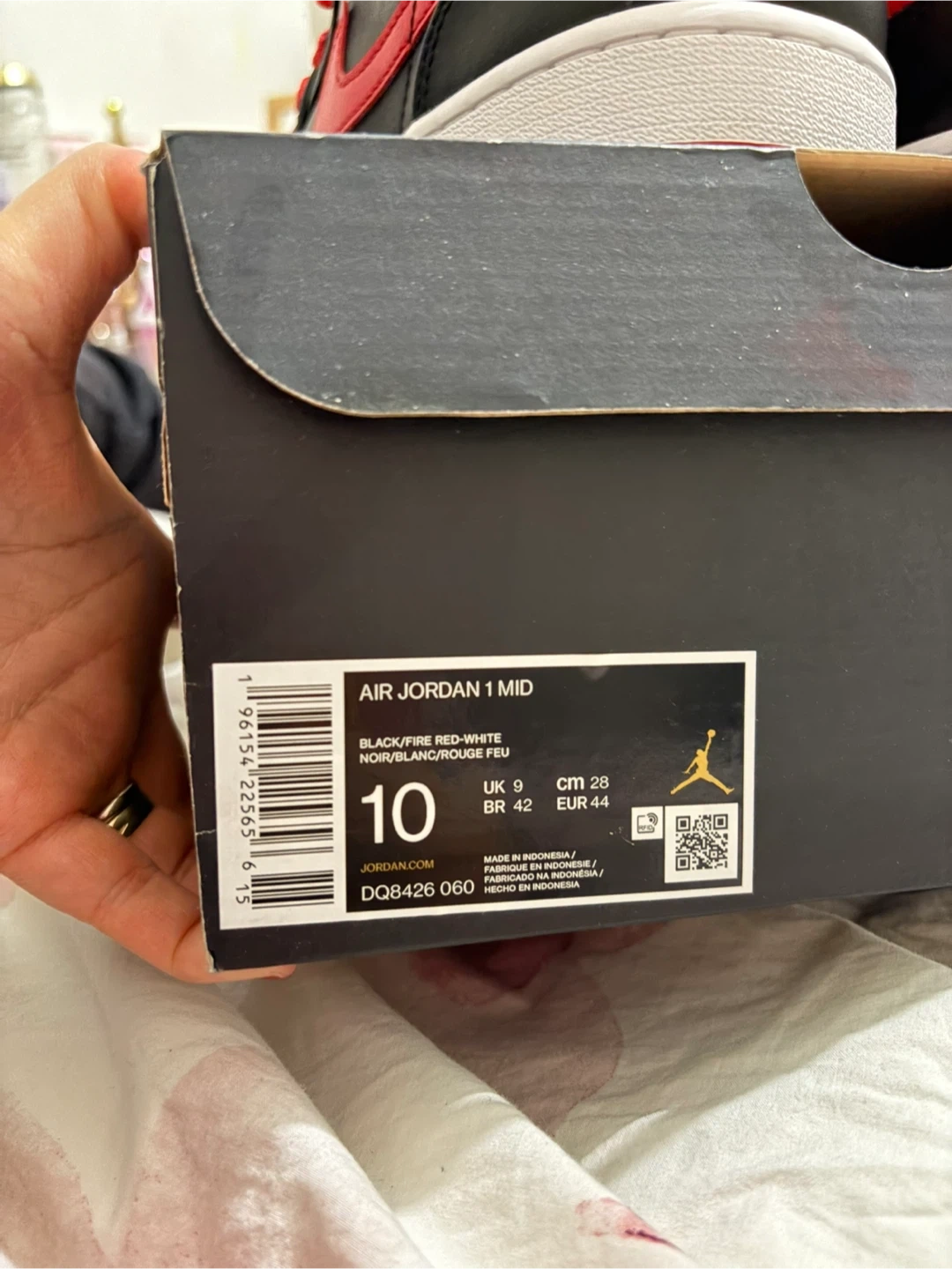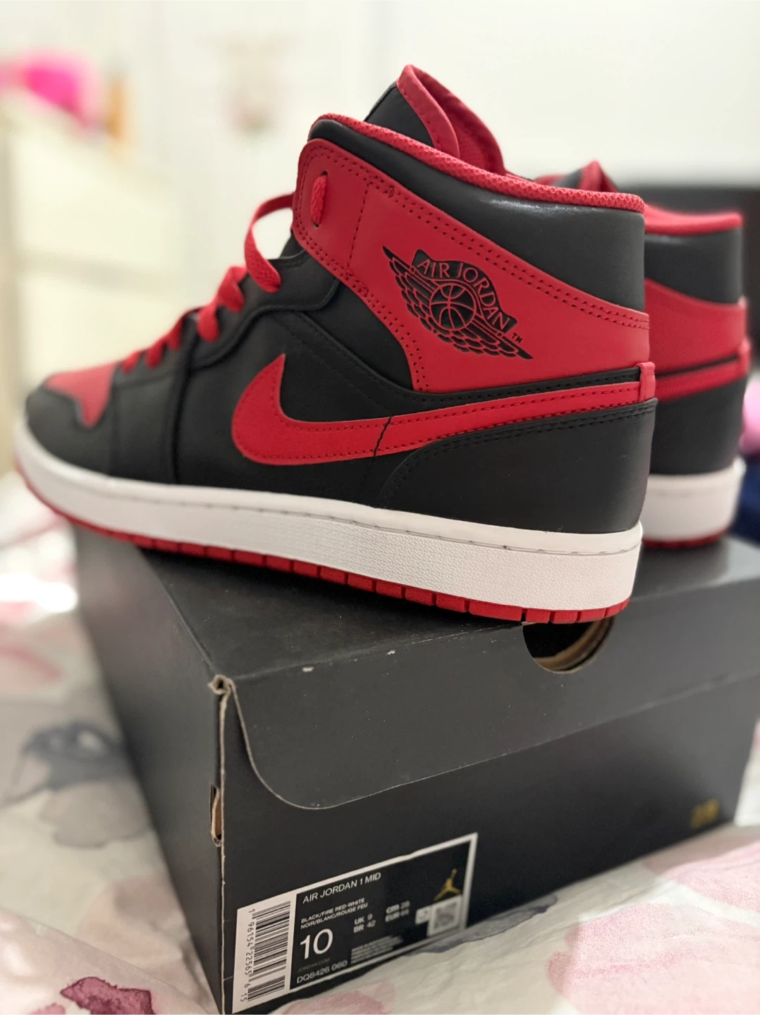 Selling a pair of Nike Air Jordan 1 Mid sneakers in black and red! They are in great condition and come with the original box. Size is 10 US