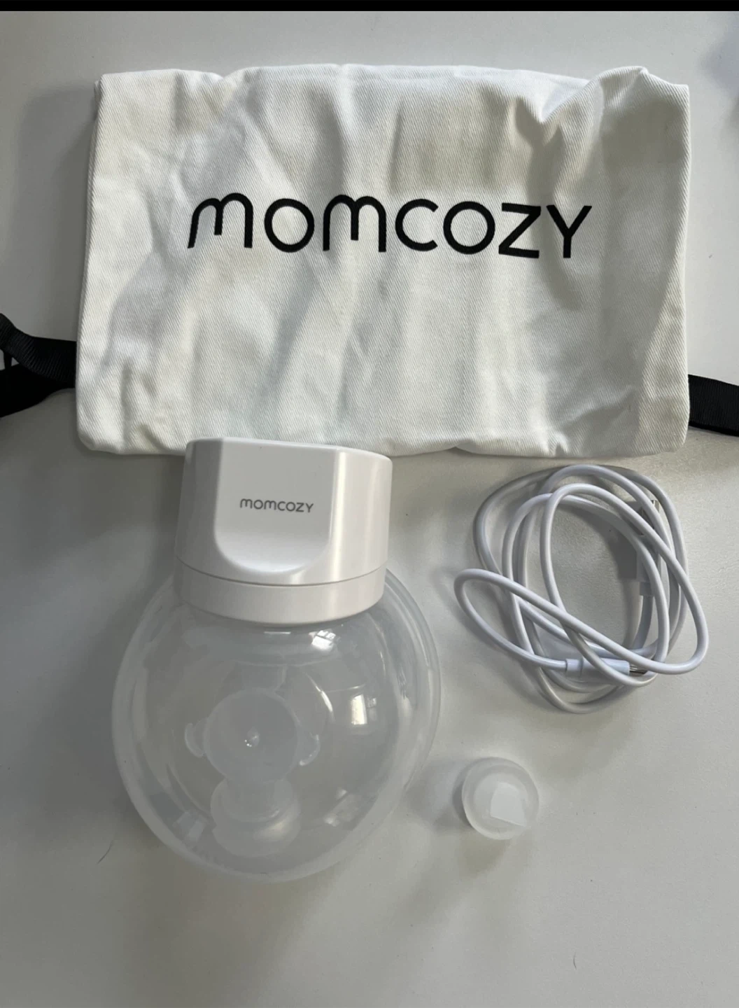 Momcozy hands-free breast pump. Wireless, portable, 3 modes & 9 levels. Includes carrying bag and charging cable, 2 flange, 24mm. 1 pack only