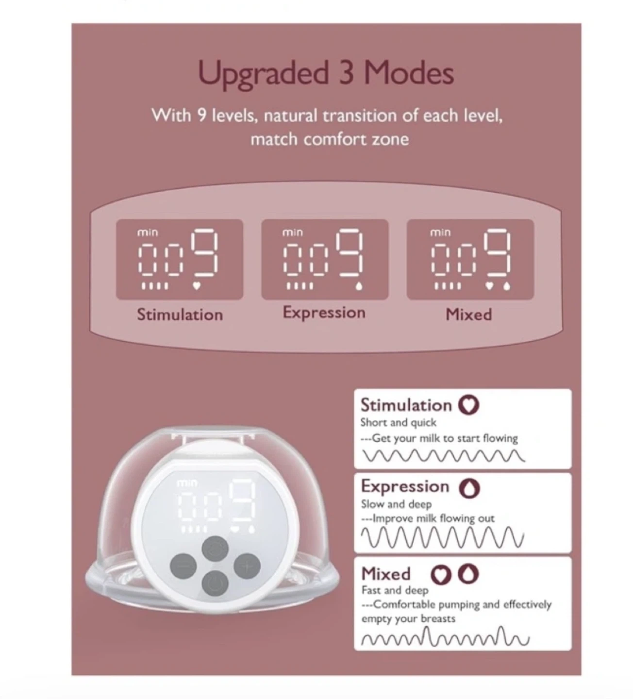 Momcozy hands-free breast pump. Wireless, portable, 3 modes & 9 levels. Includes carrying bag and charging cable, 2 flange, 24mm. 1 pack only
