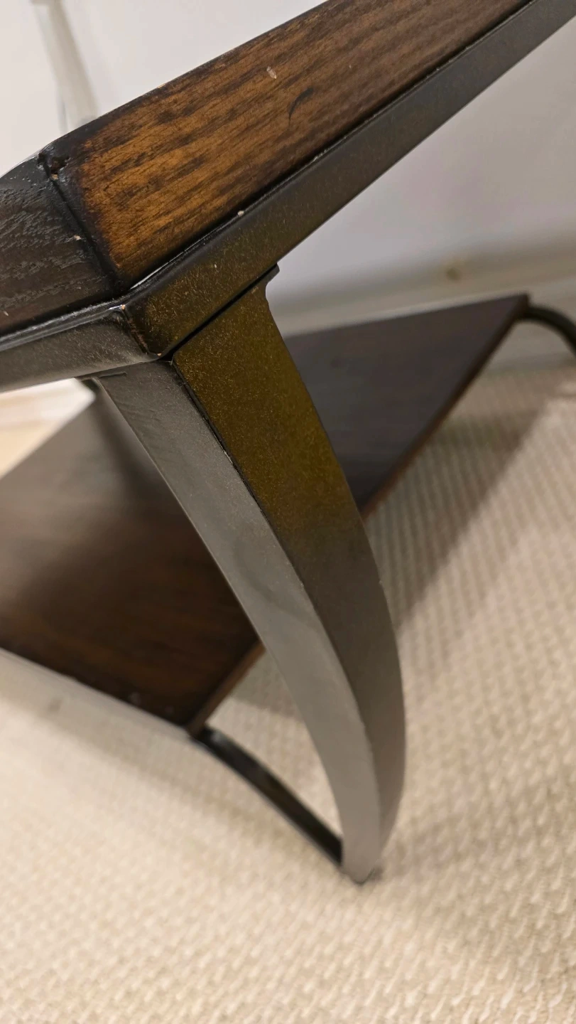 A beautiful sturdy high quality wooden coffee table with a dark finish! It has a unique curved leg design and a shelf underneath for storage or display. It's in good condition and would look great in any living room. Bought it from The Brick for over $400 originally.