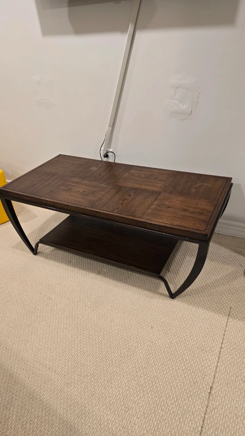 A beautiful sturdy high quality wooden coffee table with a dark finish! It has a unique curved leg design and a shelf underneath for storage or display. It's in good condition and would look great in any living room. Bought it from The Brick for over $400 originally.
