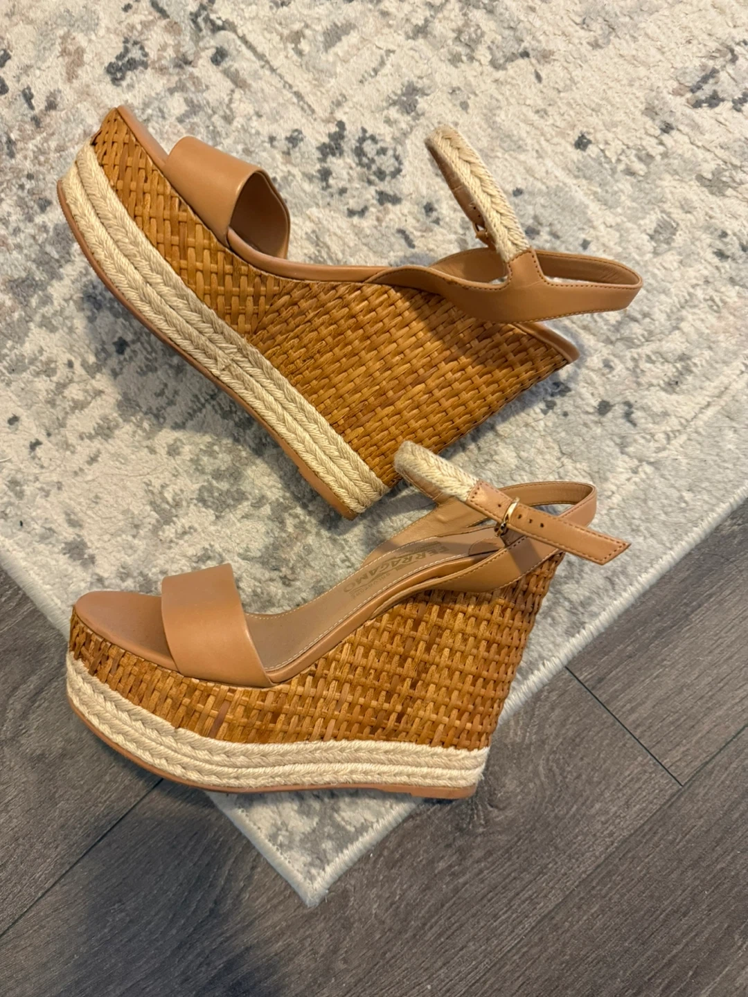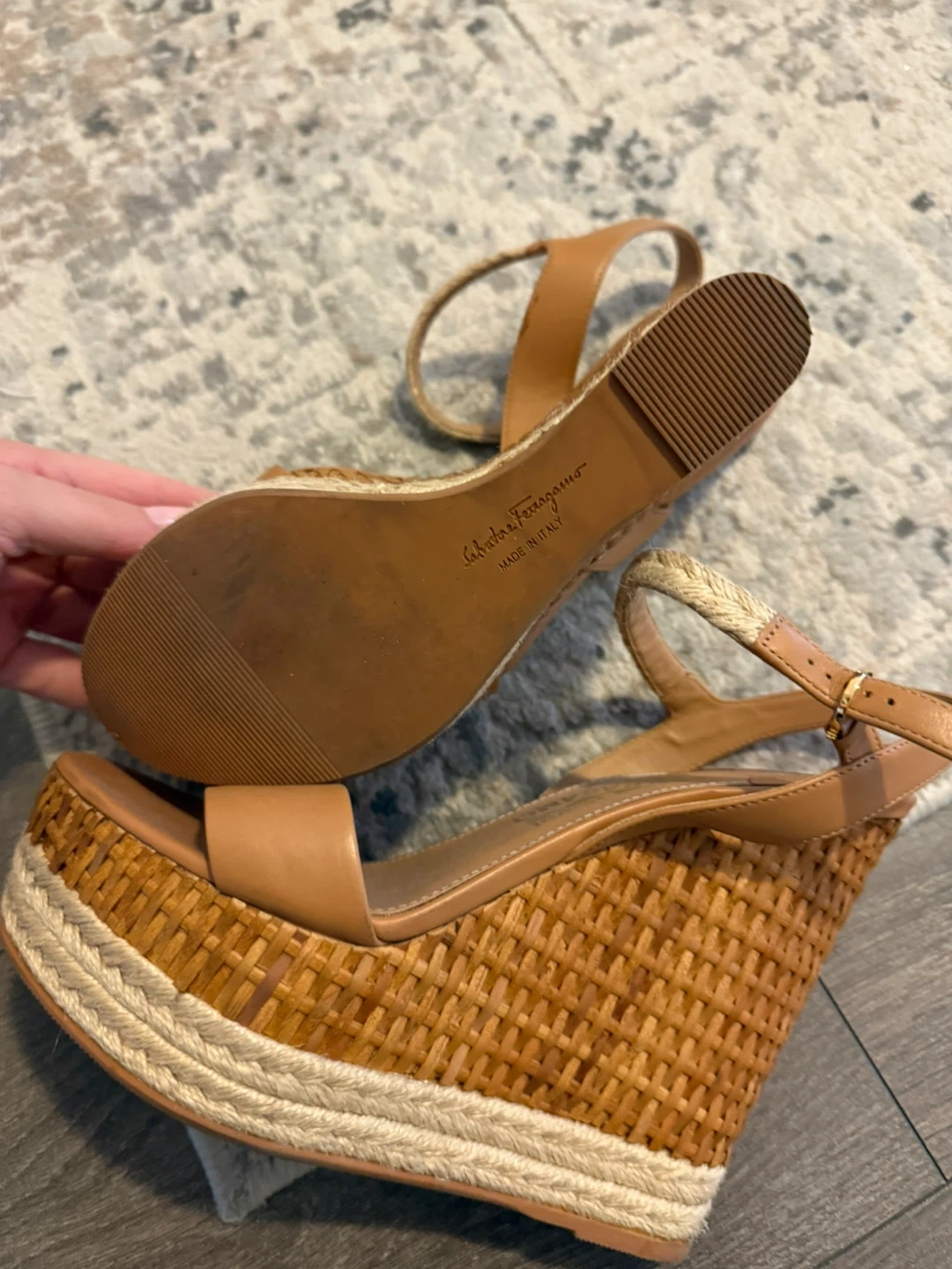 Selling a pair of Salvatore Ferragamo wedge sandals. They're a size 39 and in excellent condition! The wedges have a woven texture and a cute espadrille trim. Perfect for summer!