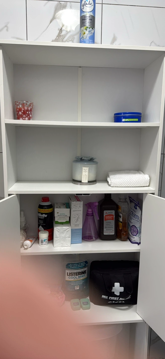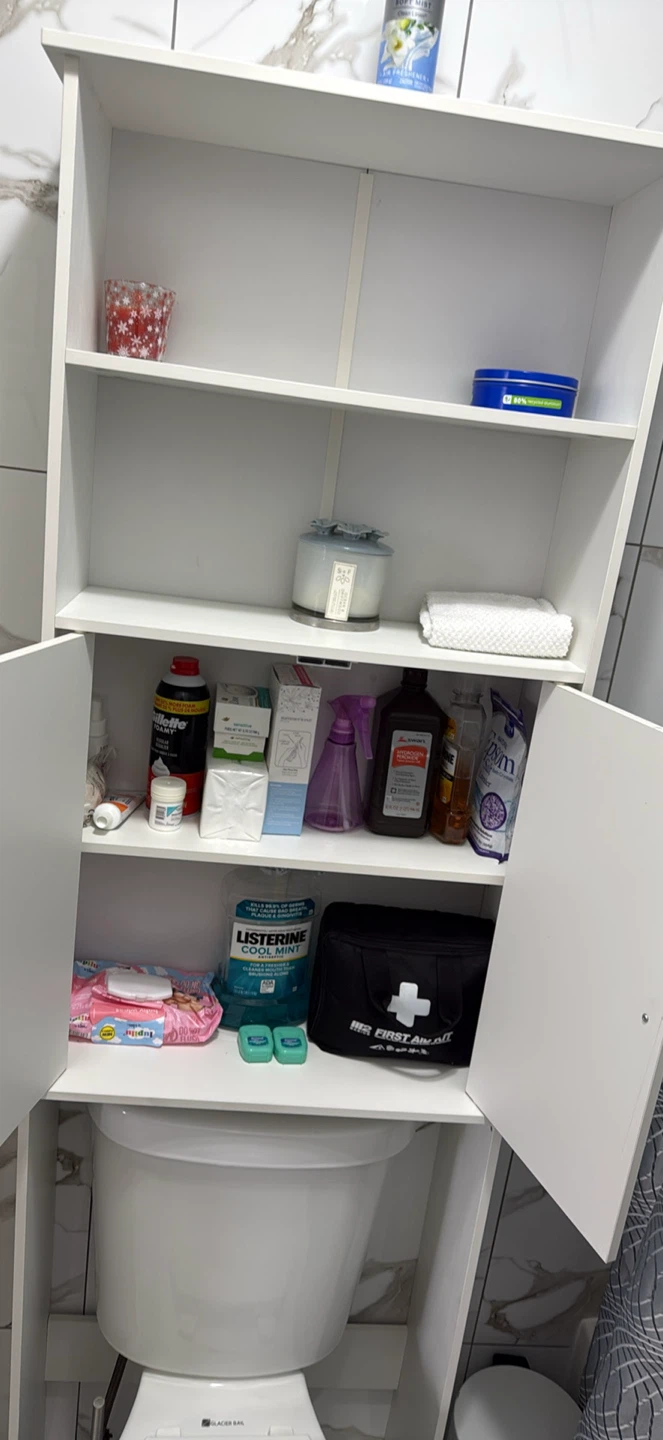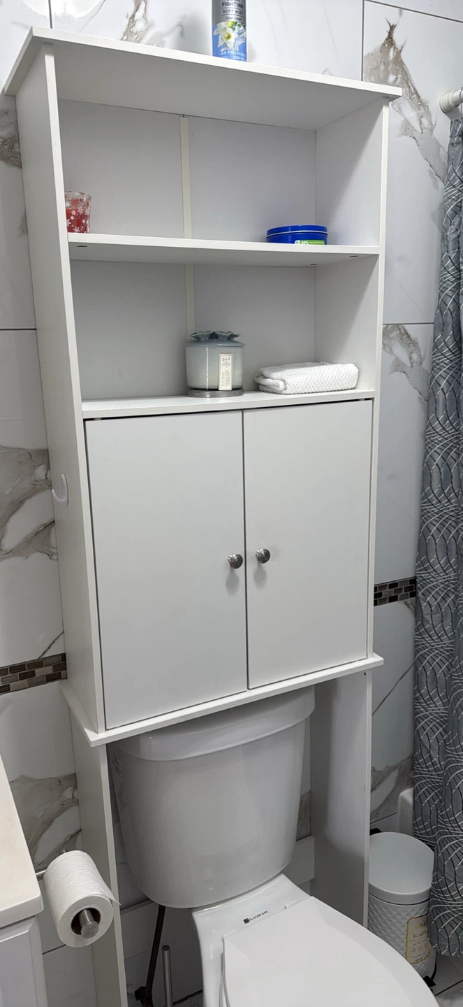 Selling a white over-the-toilet bathroom cabinet! It's in great condition and provides extra storage space in your bathroom. Perfect for organizing toiletries and other essentials