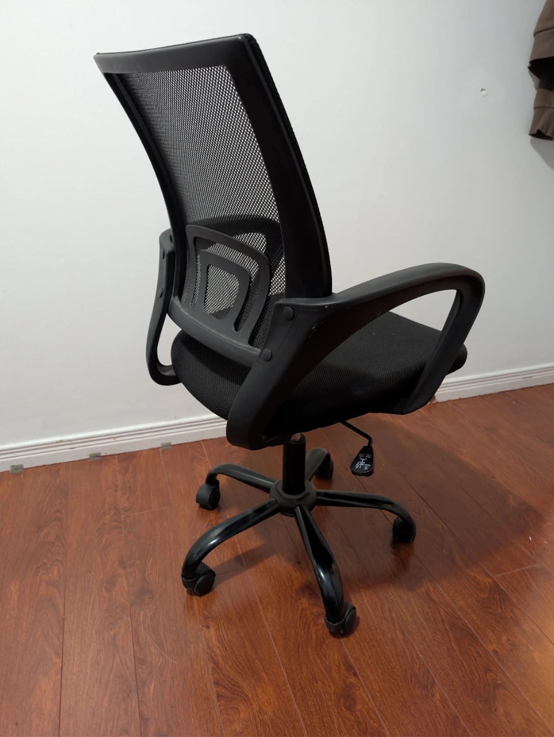 Looking to sell this office chair! It's in great condition and has a comfortable mesh back. The chair is black and features a padded seat and armrests. It's perfect for your home office or study space!