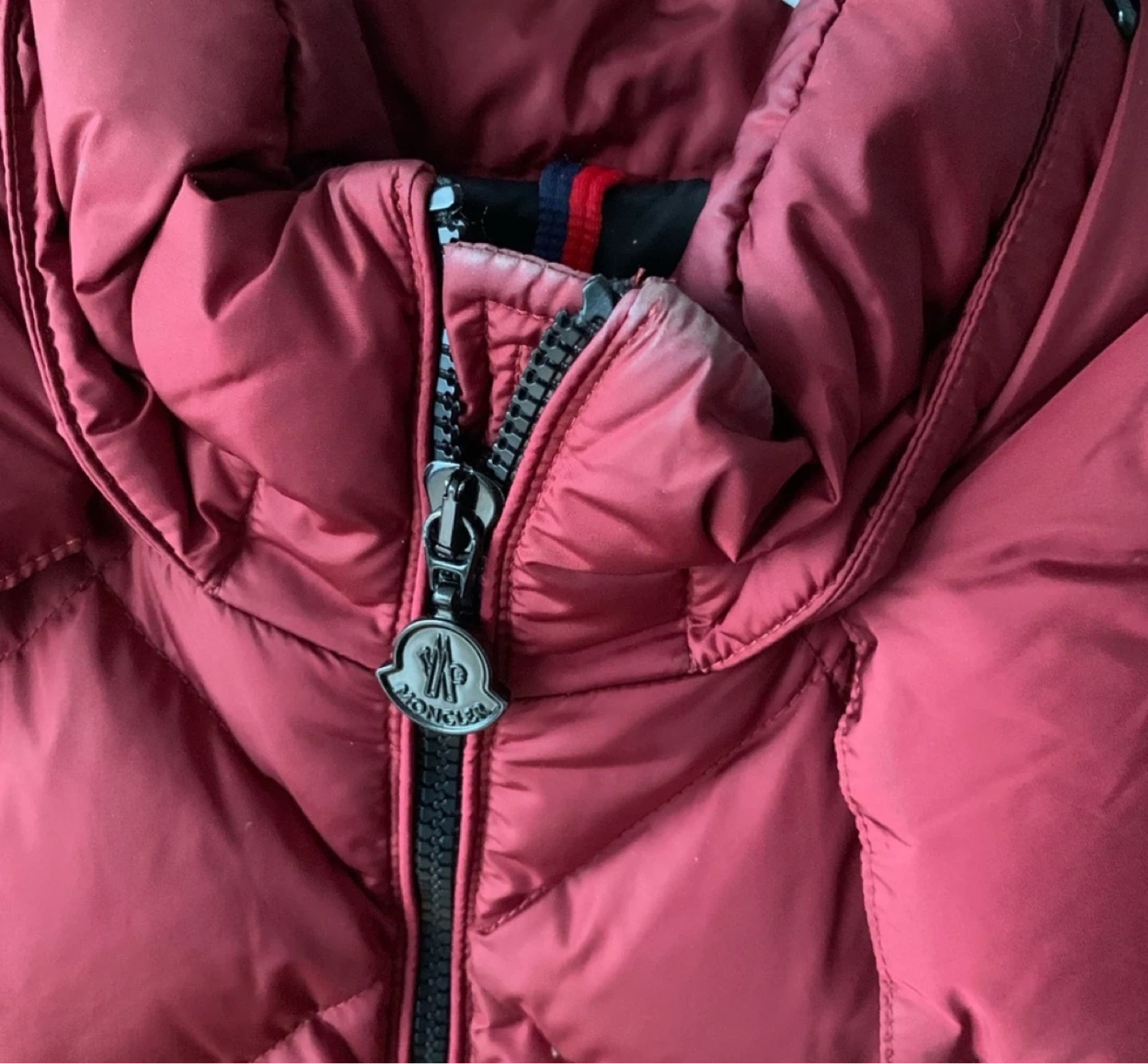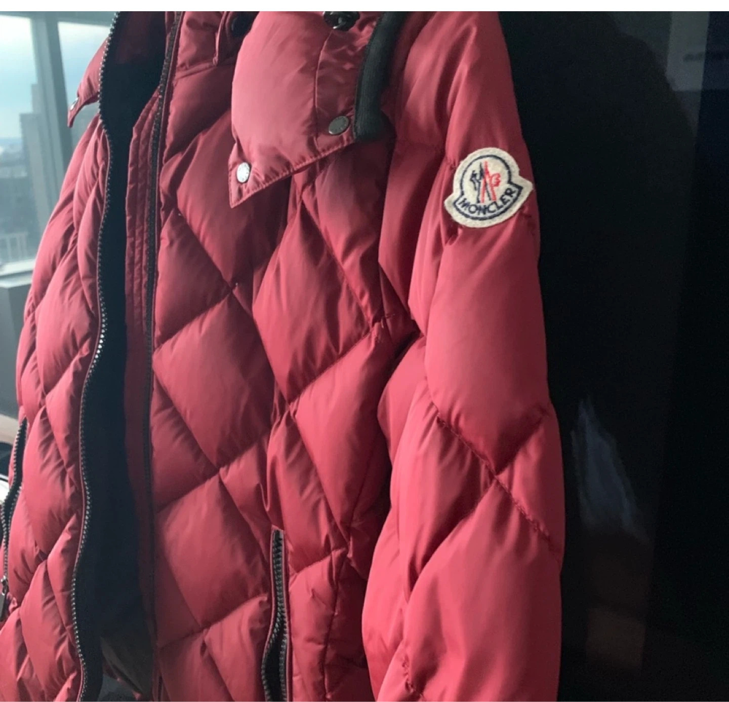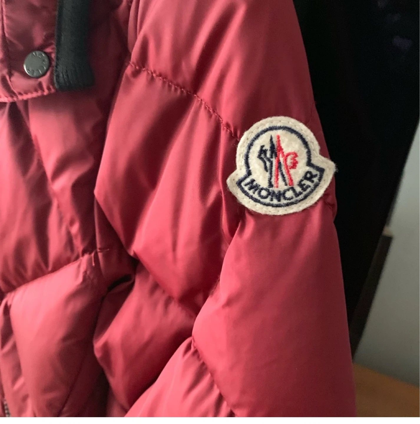Selling a stylish Moncler red padded down jacket. Perfect for staying warm and fashionable during the colder months. It features a quilted design and the iconic Moncler logo patch on the sleeve. Great for everyday wear!