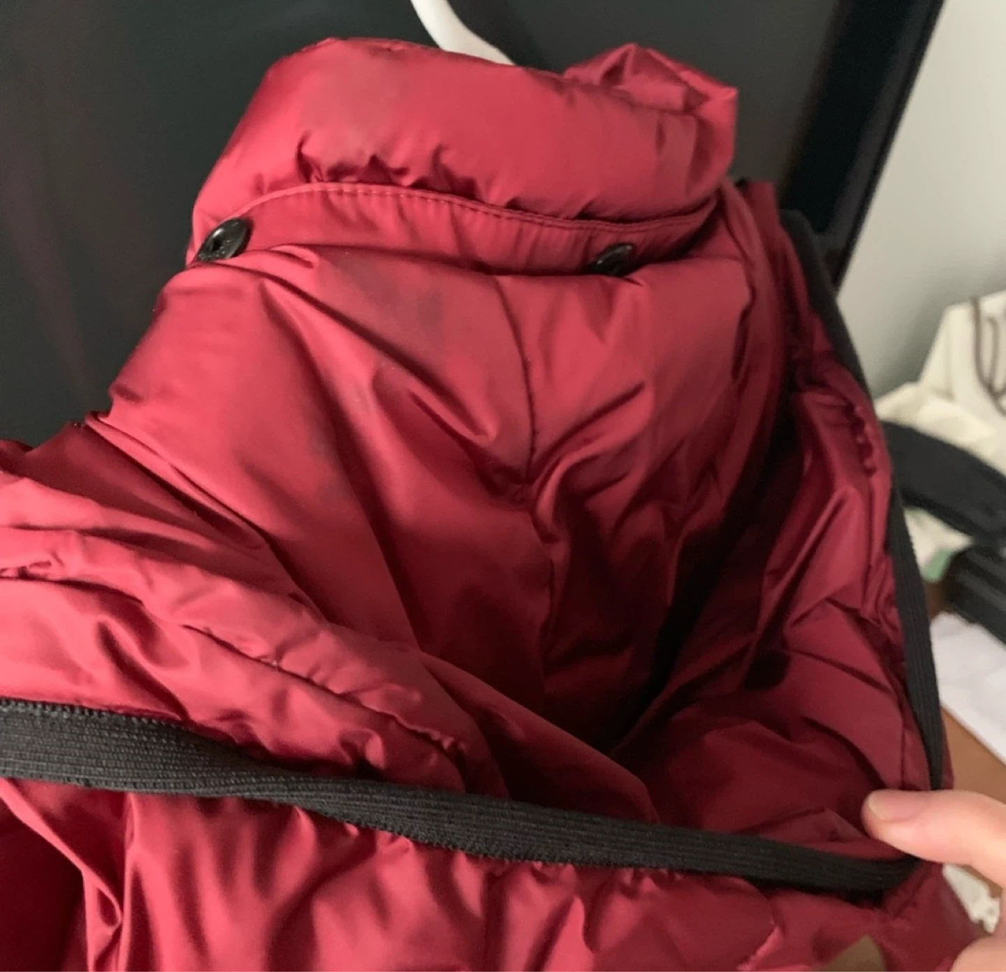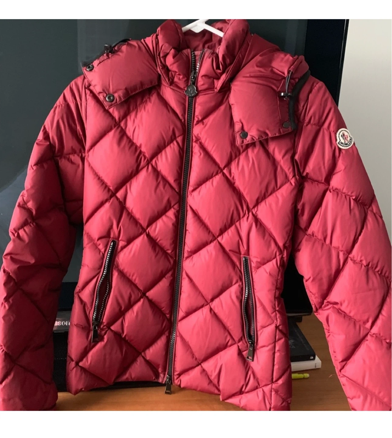 Selling a stylish Moncler red padded down jacket. Perfect for staying warm and fashionable during the colder months. It features a quilted design and the iconic Moncler logo patch on the sleeve. Great for everyday wear!