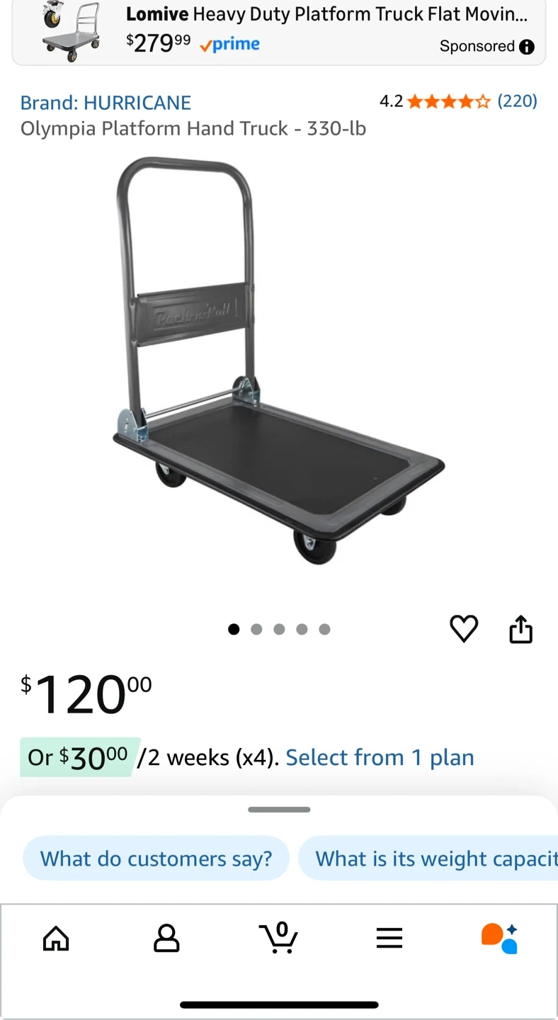 I'm selling Olympia Platform Hand Truck with a 330-lb capacity. It's still in its original packaging.