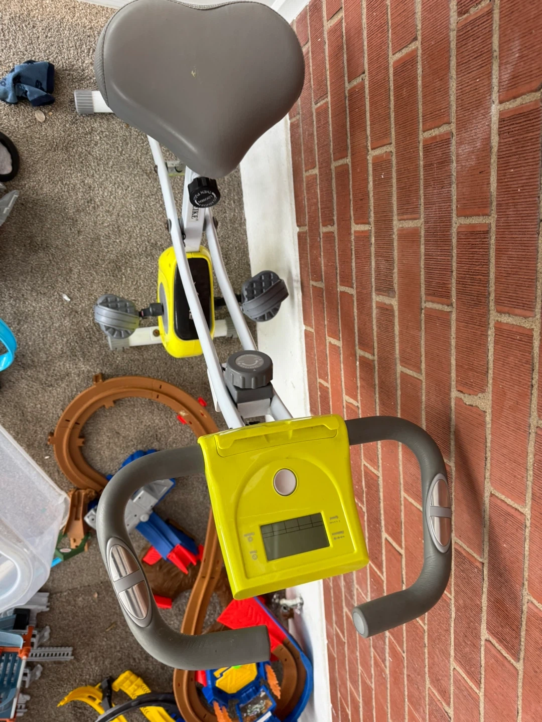 Looking to sell my exercise bike! It's in great shape and ready for someone who wants to get a workout in at home. The bike is a mix of yellow, grey, and white, and it has a digital display to track your progress. Perfect for small spaces!