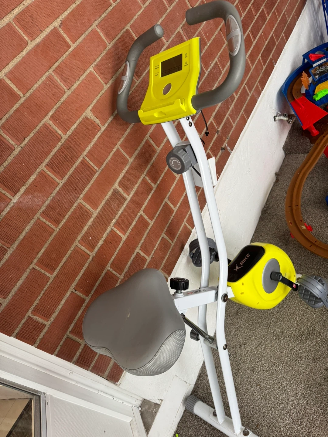 Looking to sell my exercise bike! It's in great shape and ready for someone who wants to get a workout in at home. The bike is a mix of yellow, grey, and white, and it has a digital display to track your progress. Perfect for small spaces!