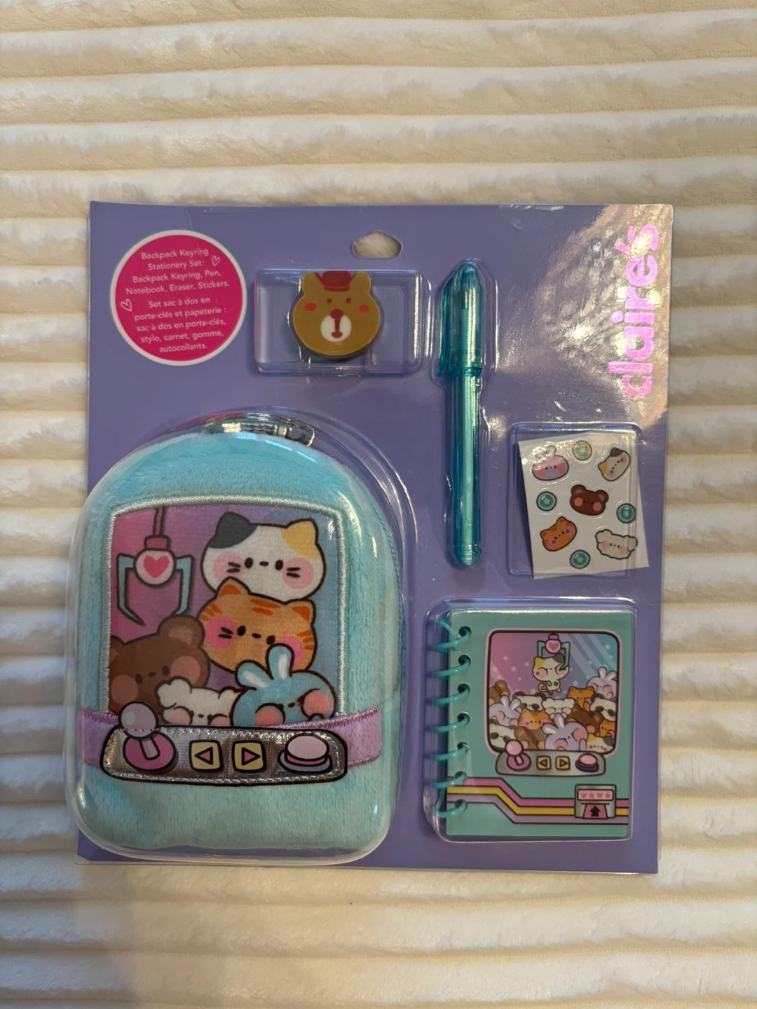 I'm selling a brand new Claire's Backpack Keyring Stationery Set! It includes a backpack keyring, pen, notebook, eraser, and stickers. This set is perfect for kids and stationery lovers.