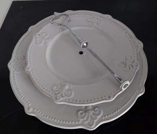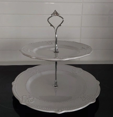 Two-Tiered White Serving Stand is a versatile serving piece, ideal for special events and gatherings. It features two white plates of different sizes arranged in a tiered design, providing ample space for pastries, snacks, desserts, or other party items.