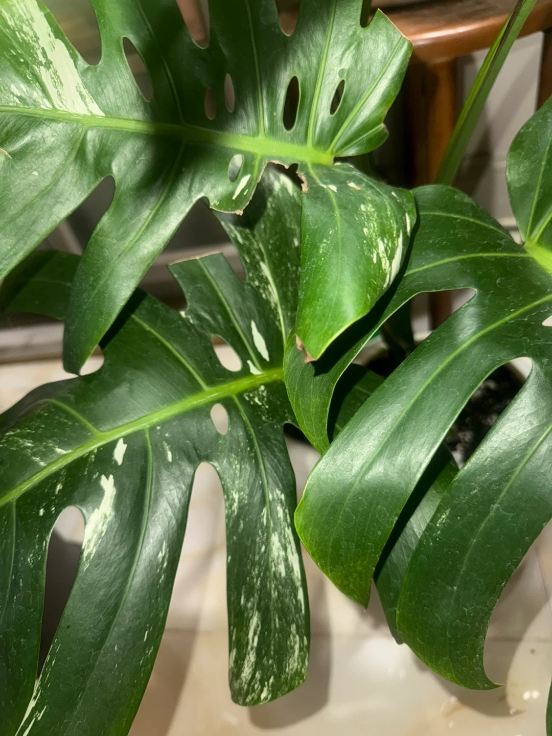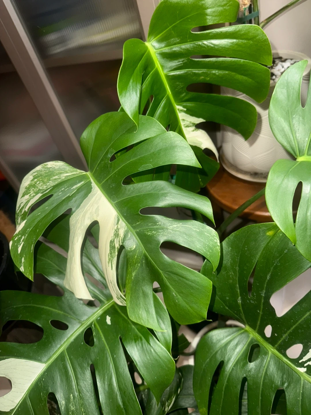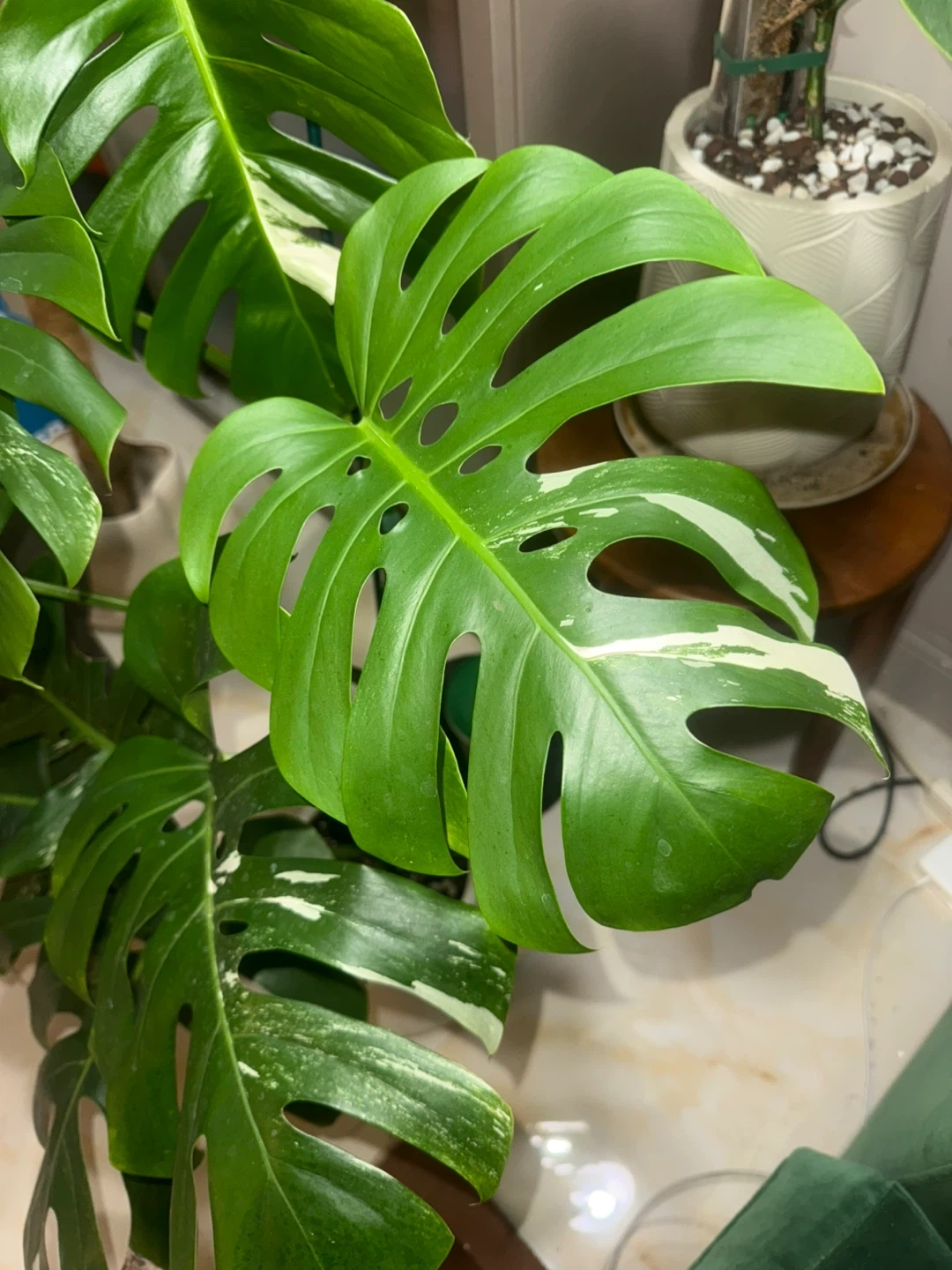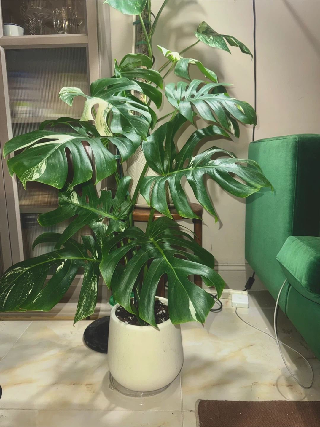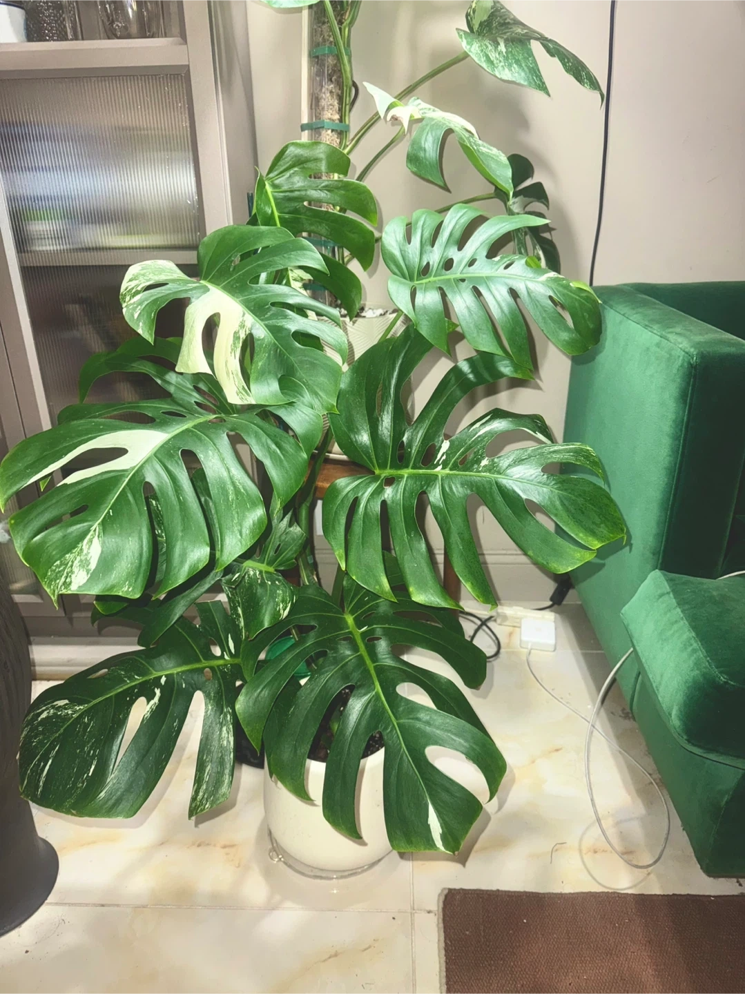 a beautiful Monstera Albo Variegata plant! It's a stunning addition to any indoor garden with its unique variegated leaves. This plant is healthy, large size and well-cared for, ready to bring a touch of the tropics to your home. 8” white planter included