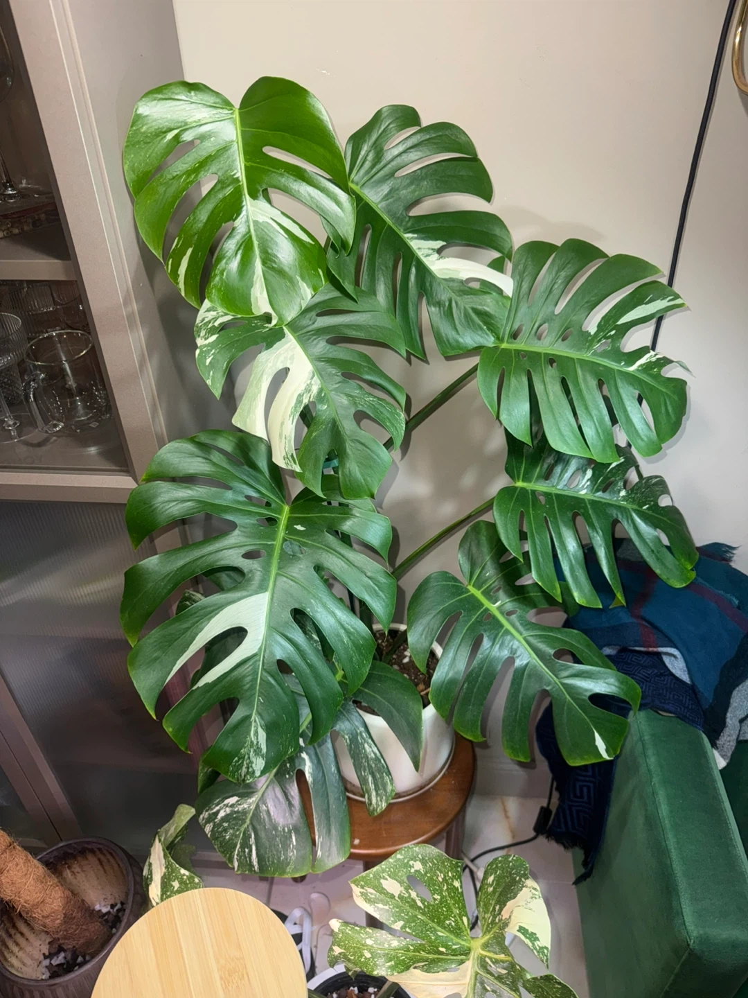 a beautiful 42” tall Monstera Albo Variegata plant! It's a stunning addition to any indoor garden with its unique variegated leaves. This plant is healthy, large size and well-cared for, ready to bring a touch of the tropics to your home. 8” white planter included