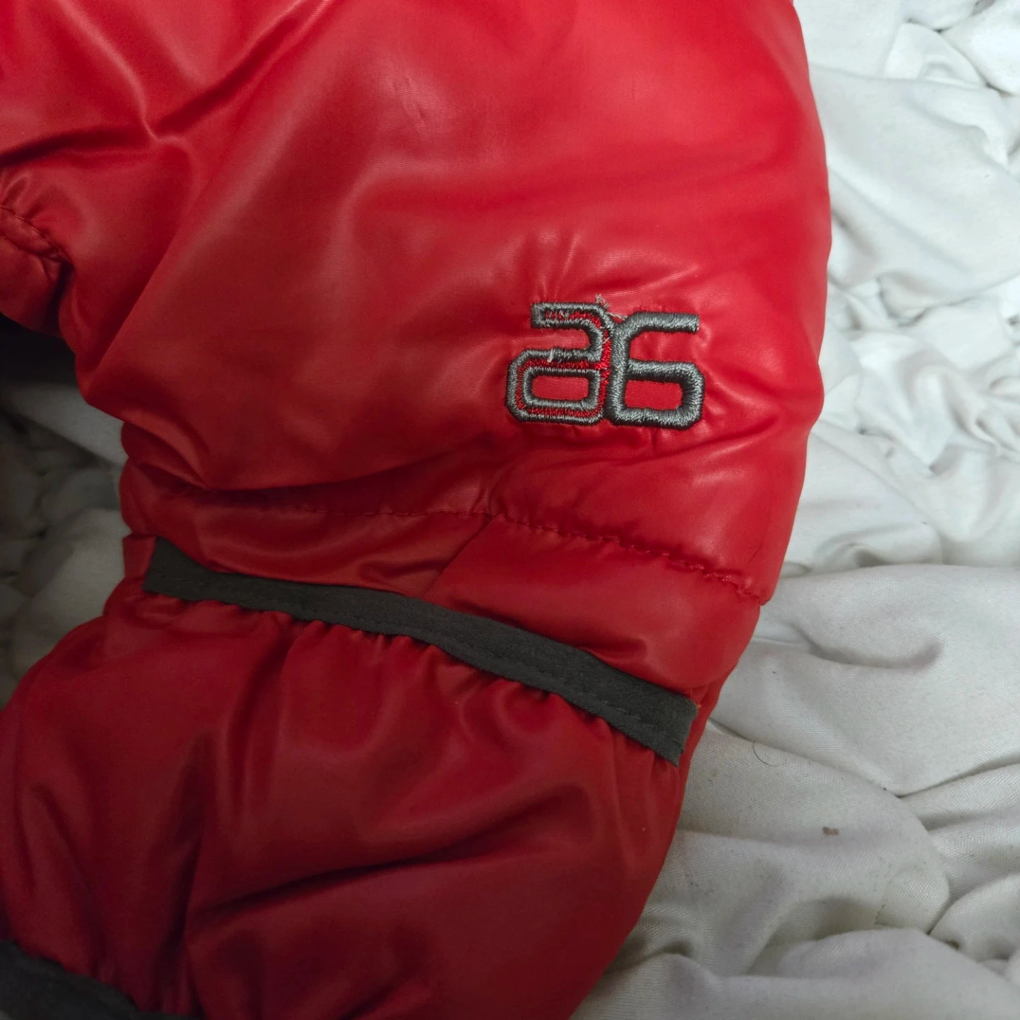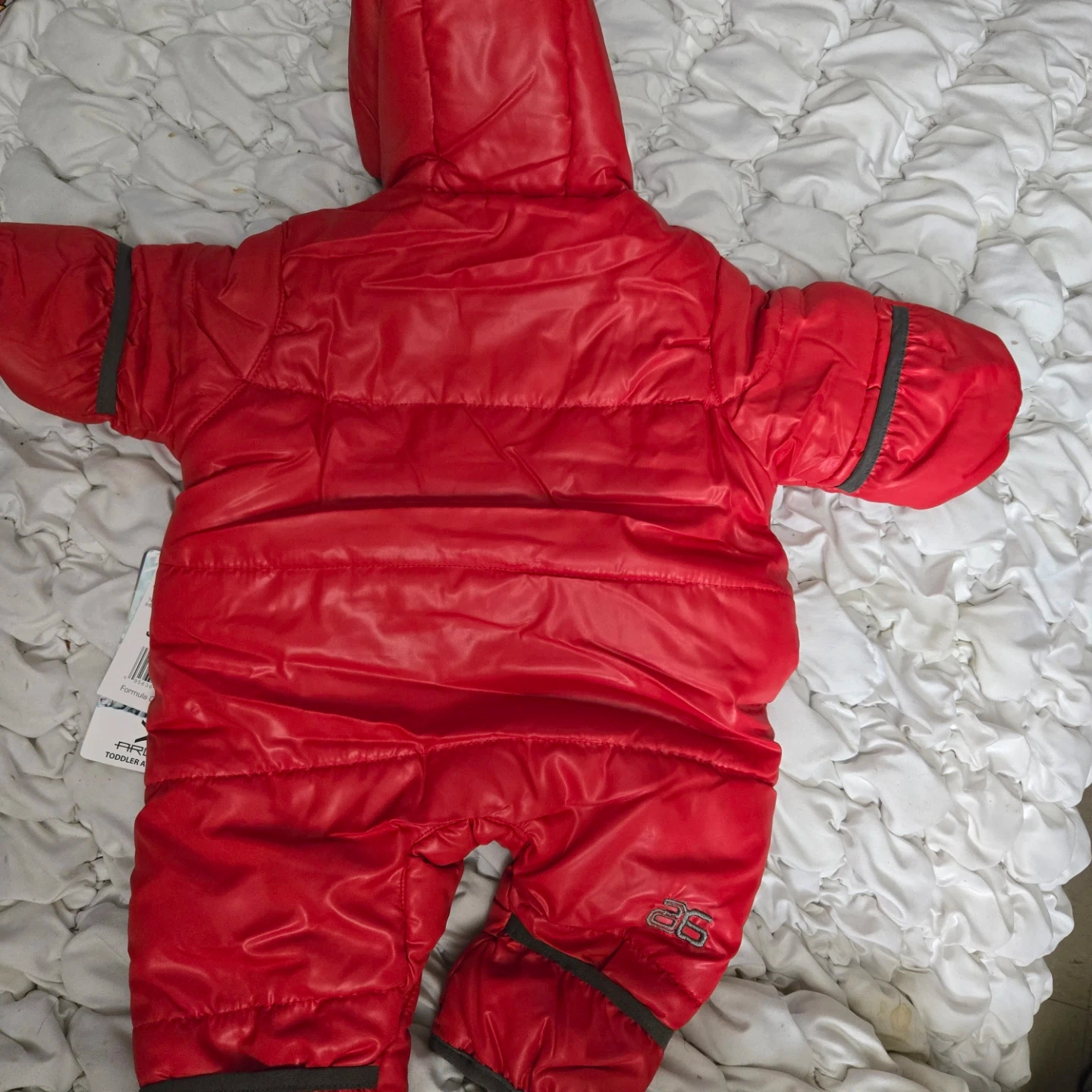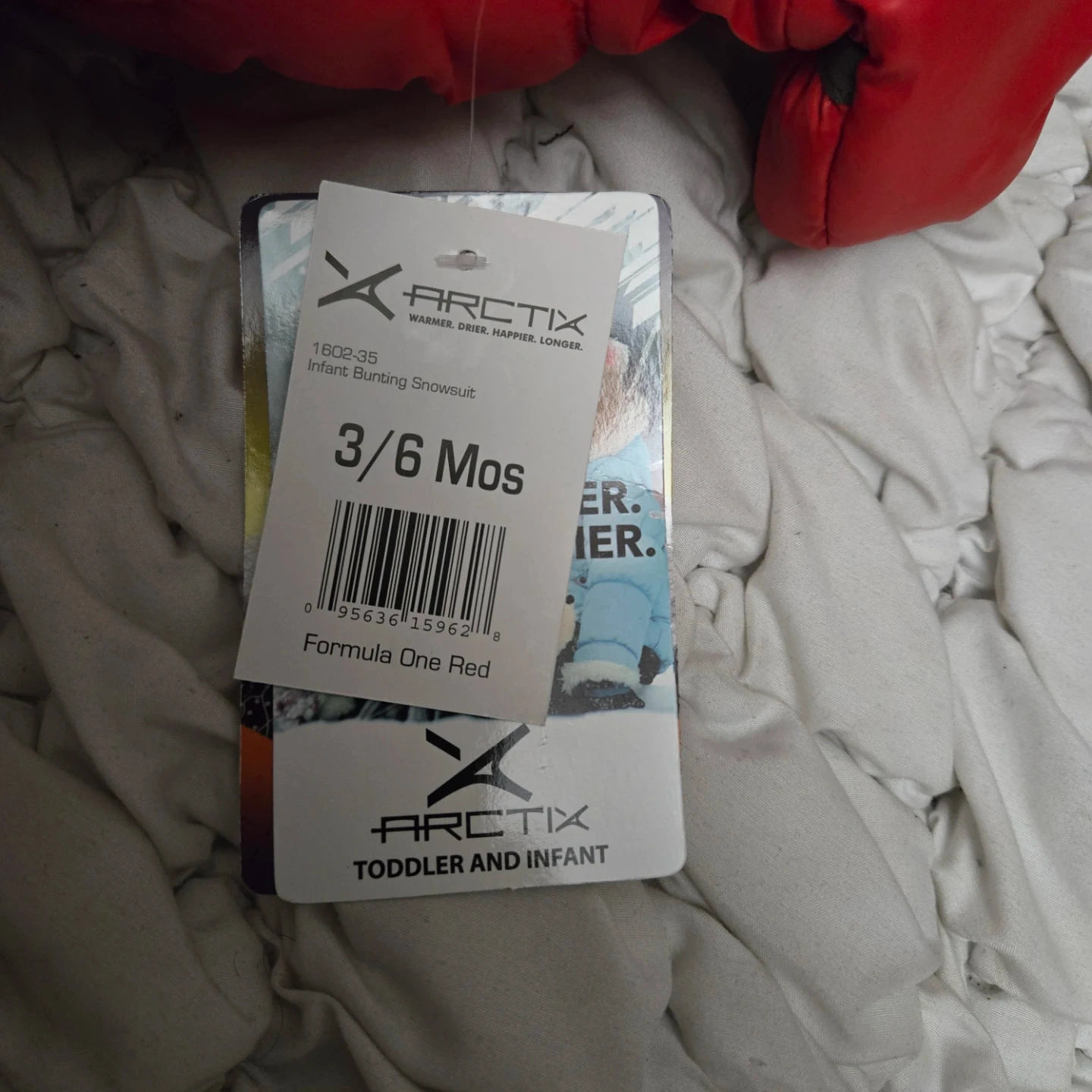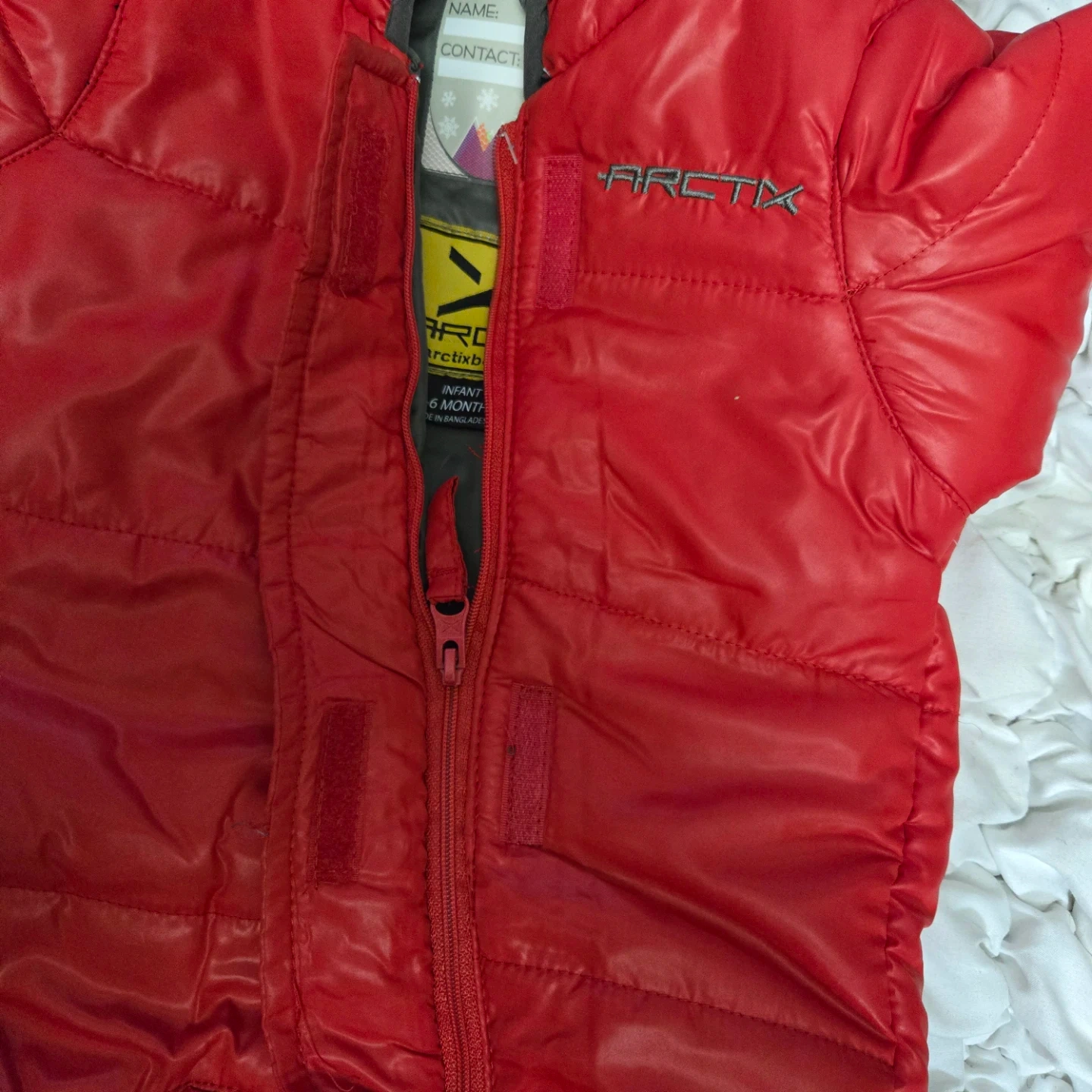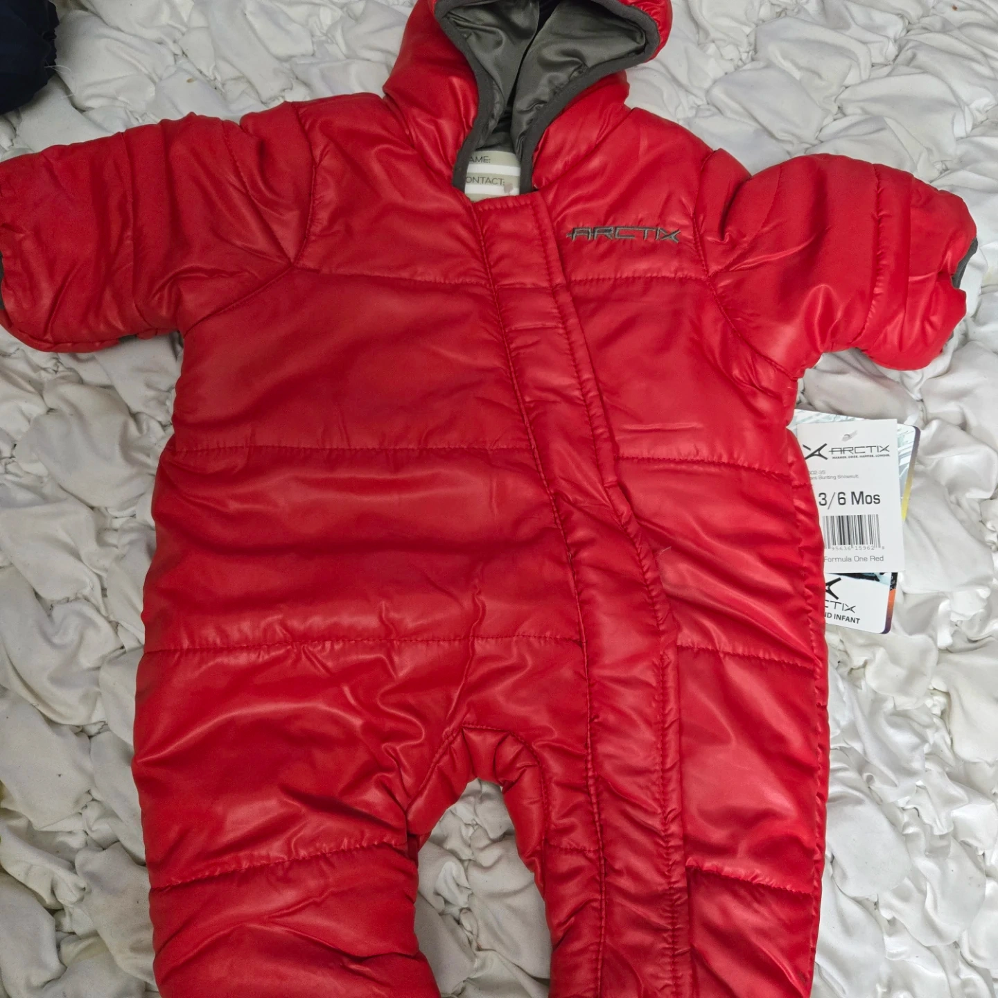 Here's a red ArcticX toddler snowsuit, perfect for keeping your little one warm this winter! It's designed for babies aged 3 to 6 months. The snowsuit is in good condition and ready for new adventures