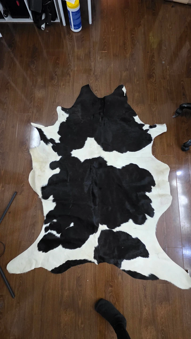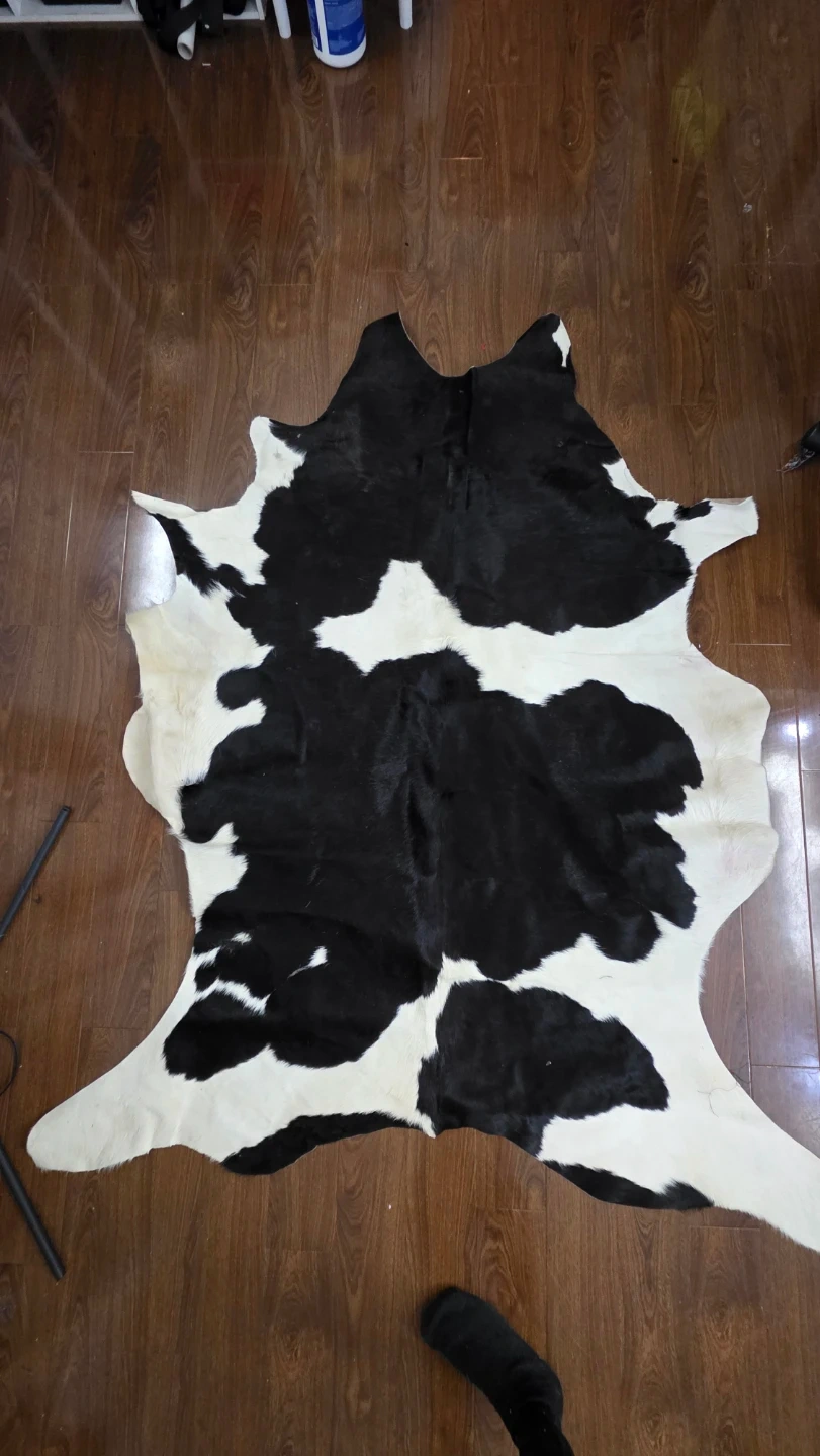 Selling a cowhide rug in black and white. It's in good condition and would look great in any room! It's a unique piece that adds a touch of rustic charm to your home decor