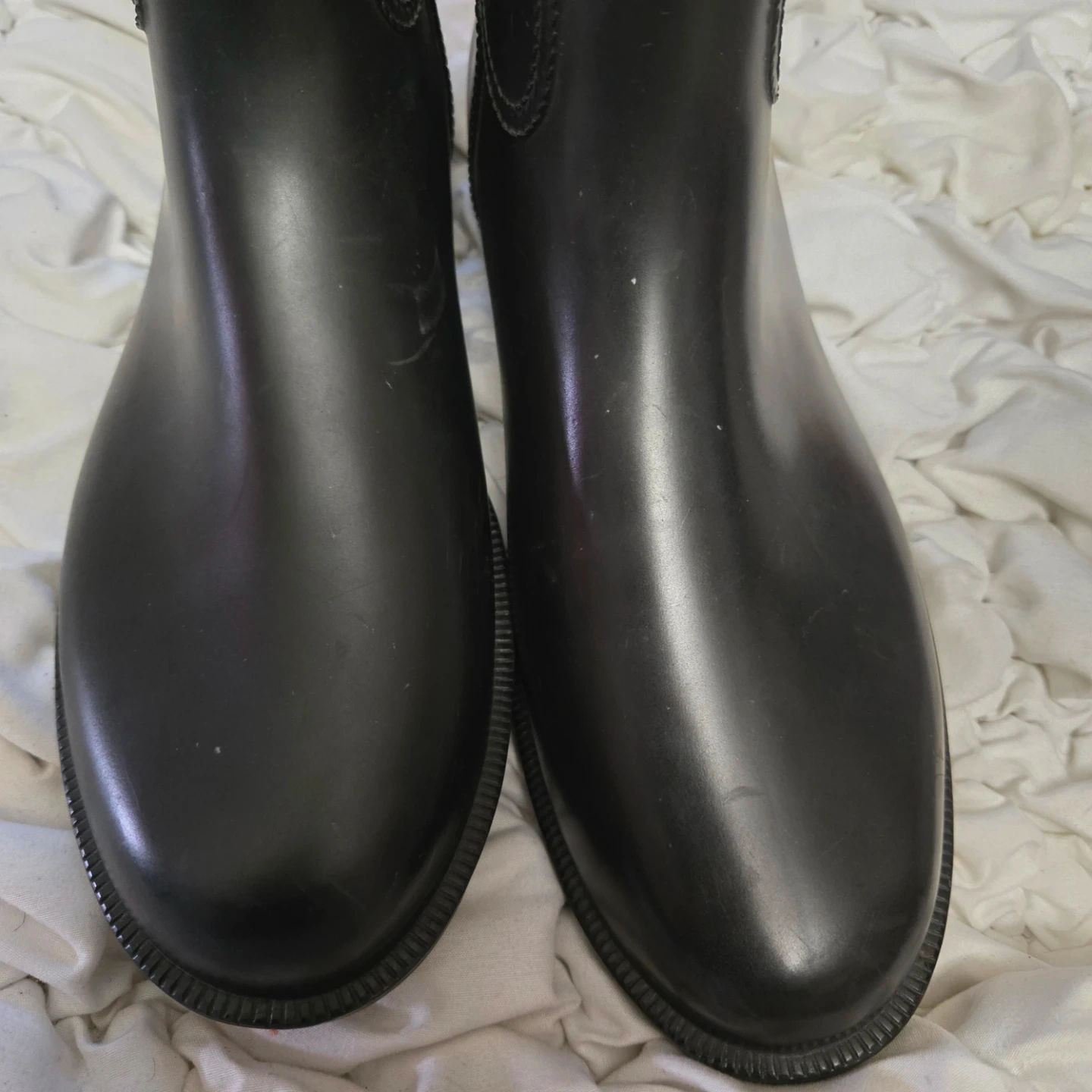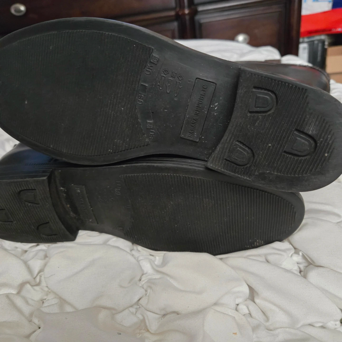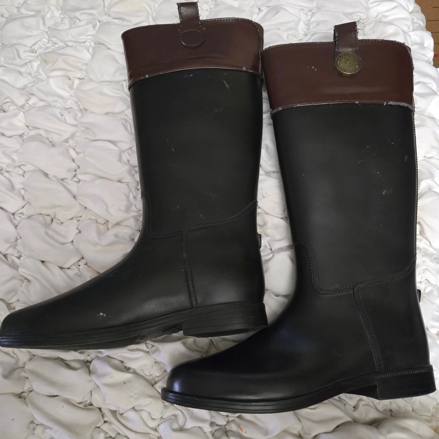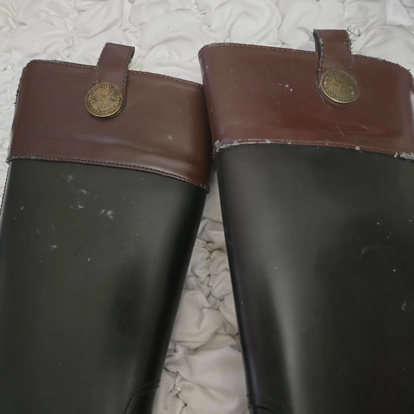 Banana Republic riding boots with a brown and black color scheme. They show some signs of wear, but are still in good condition for everyday use! Inside needs to be fixed scratches on top.