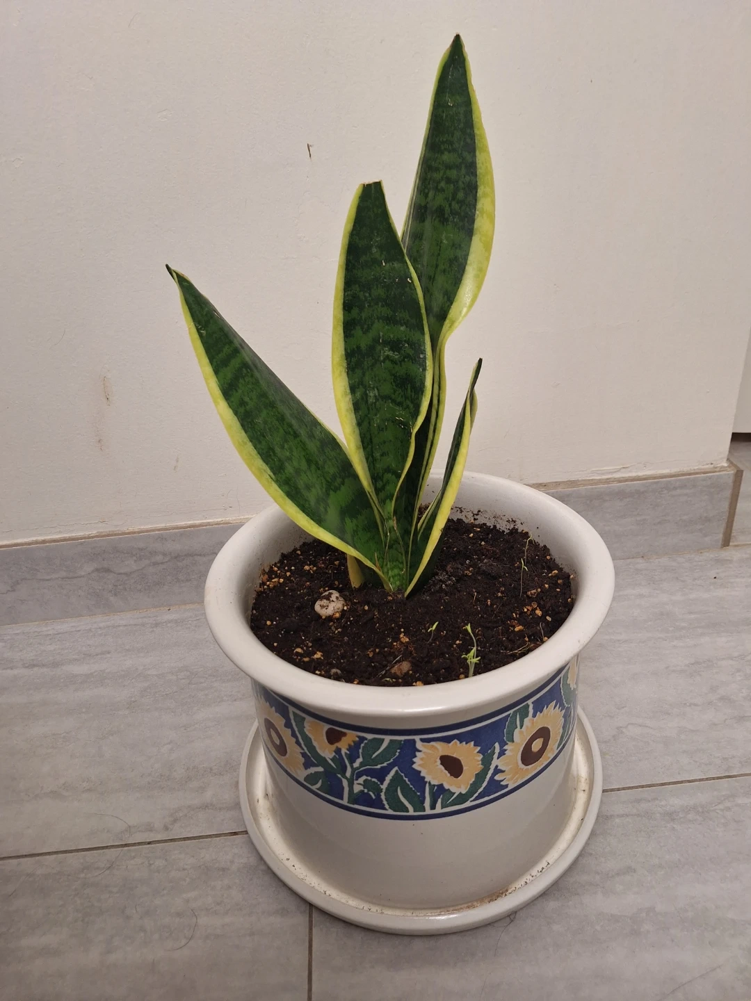 I'm selling a healthy snake plant in a decorative white pot! It's perfect for adding a touch of greenery to your home. The pot has a lovely sunflower design around the rim. It's easy to care for it. Pickup only