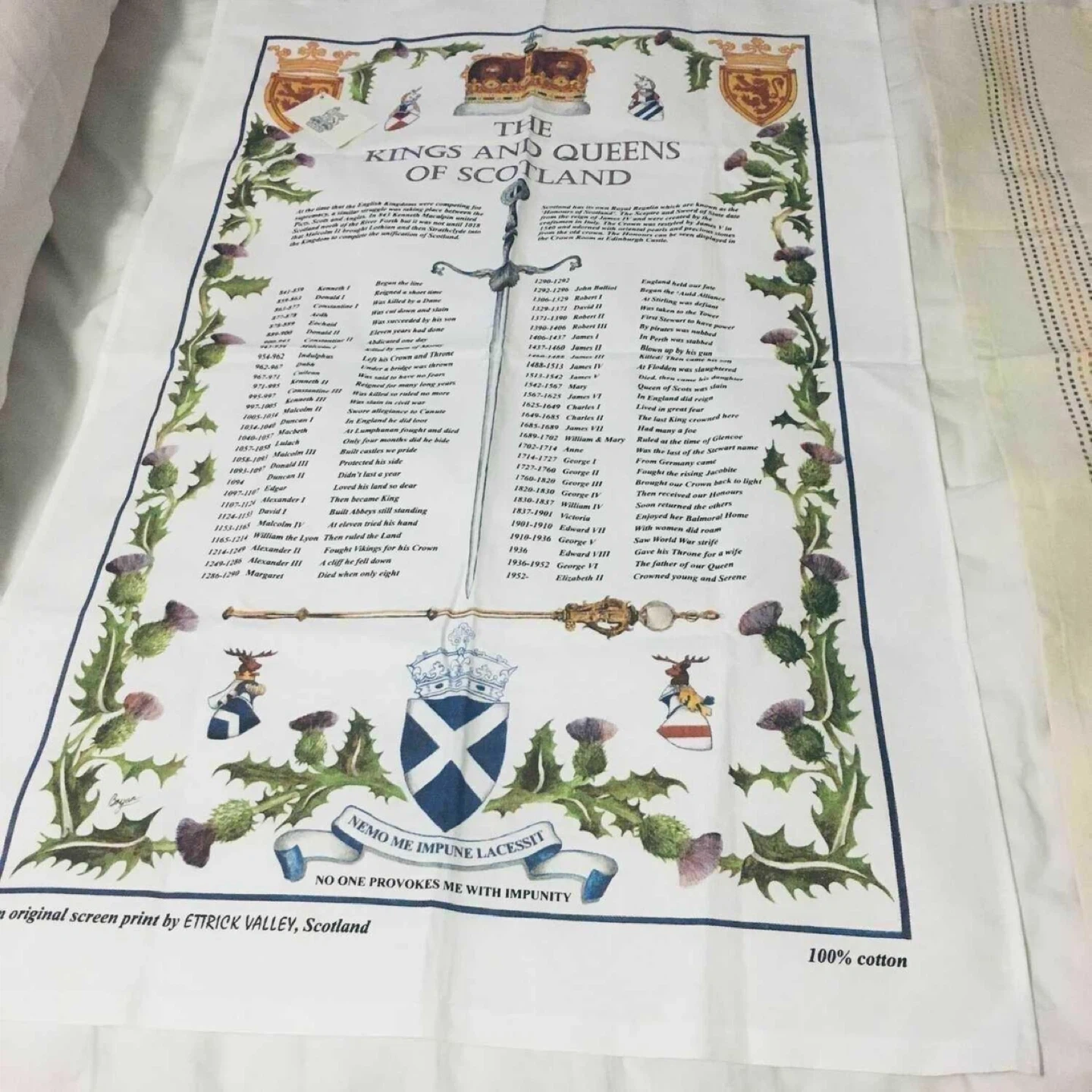 This is a new, original screen print tea towel from Ettrick Valley, Scotland. It features "The Kings and Queens of Scotland" and is made of 100% cotton. The design includes the Scottish Royal Arms and thistles.