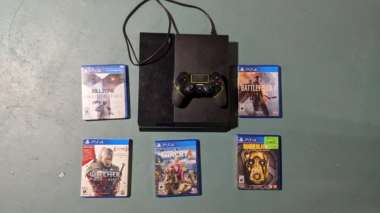 Selling a PlayStation 4 console without a Hard drive! There is an error code which simply replacing the hard drive would fix it. It comes along with a few games. The games included are Killzone Shadow Fall, Far Cry 4, Battlefield 1, and Borderlands The Handsome Collection. Great for anyone looking to get into gaming or expand their collection.