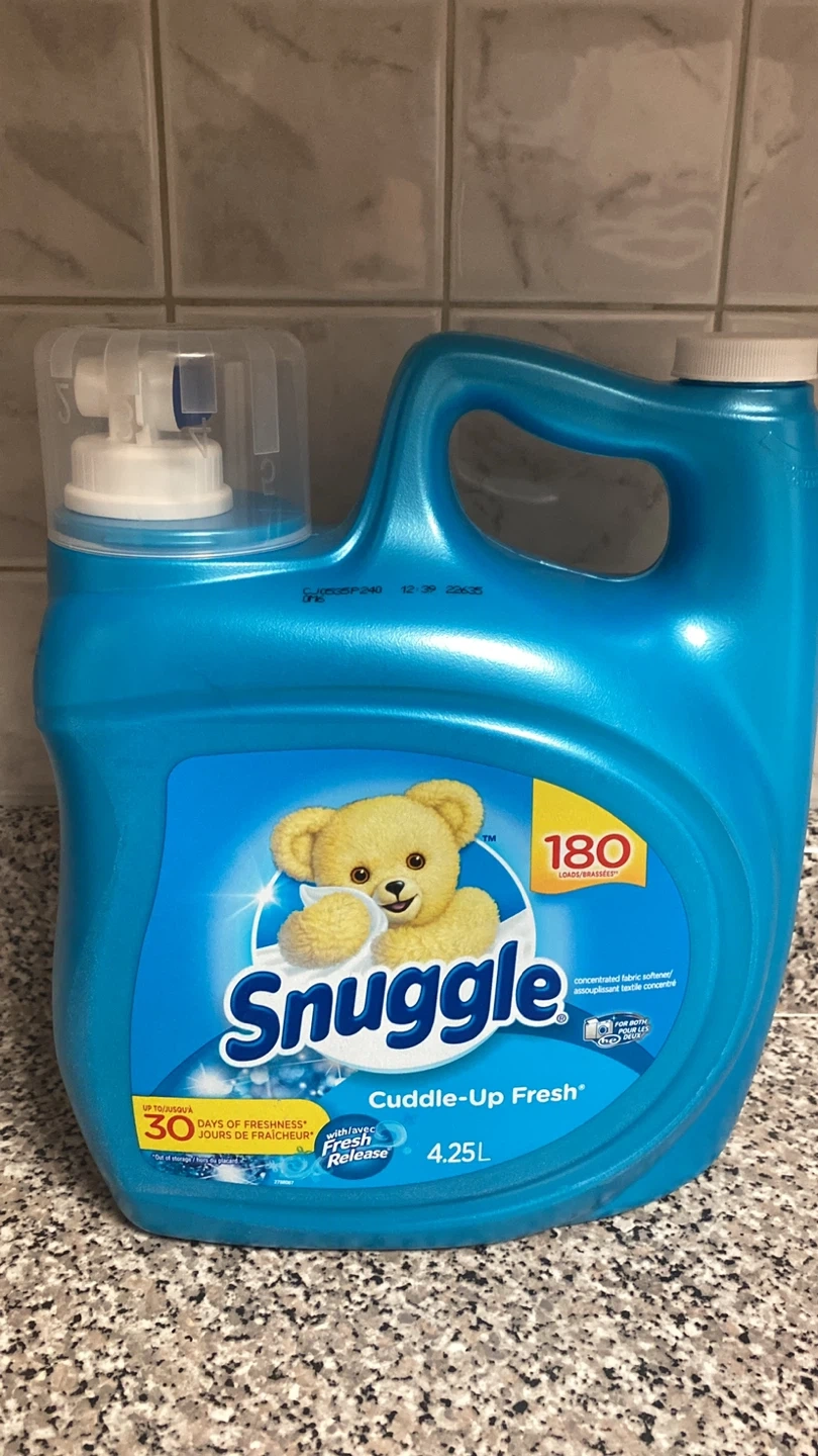 Selling a large 4.25L bottle of Snuggle Cuddle-Up Fresh concentrated fabric softener. It promises up to 30 days of freshness and provides 180 loads. Perfect for keeping your clothes soft and smelling great!