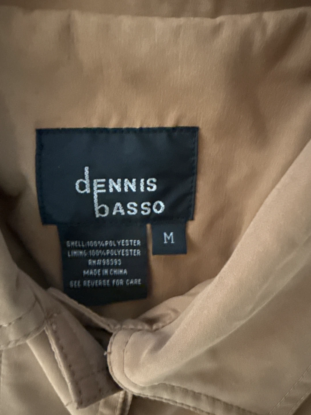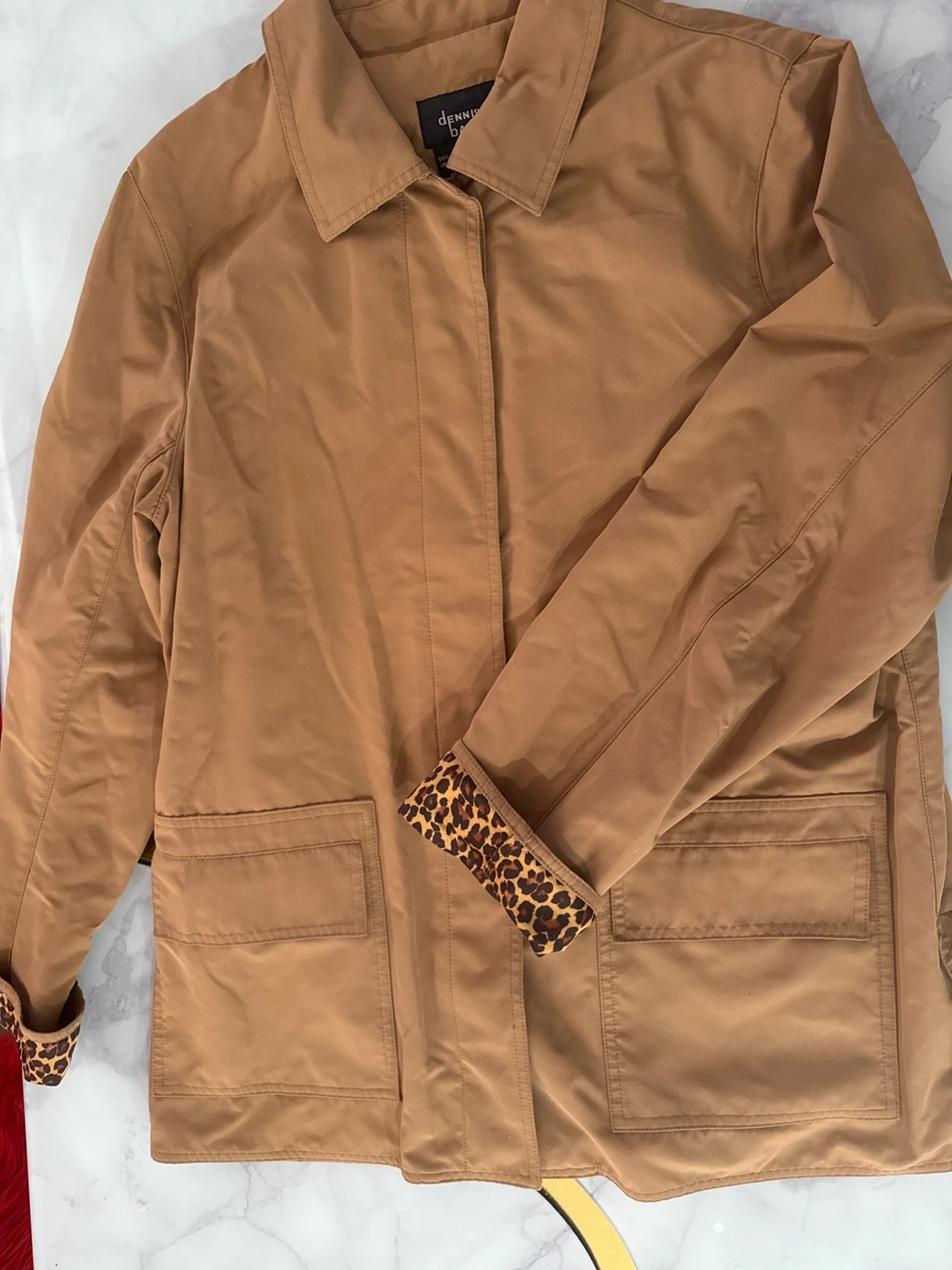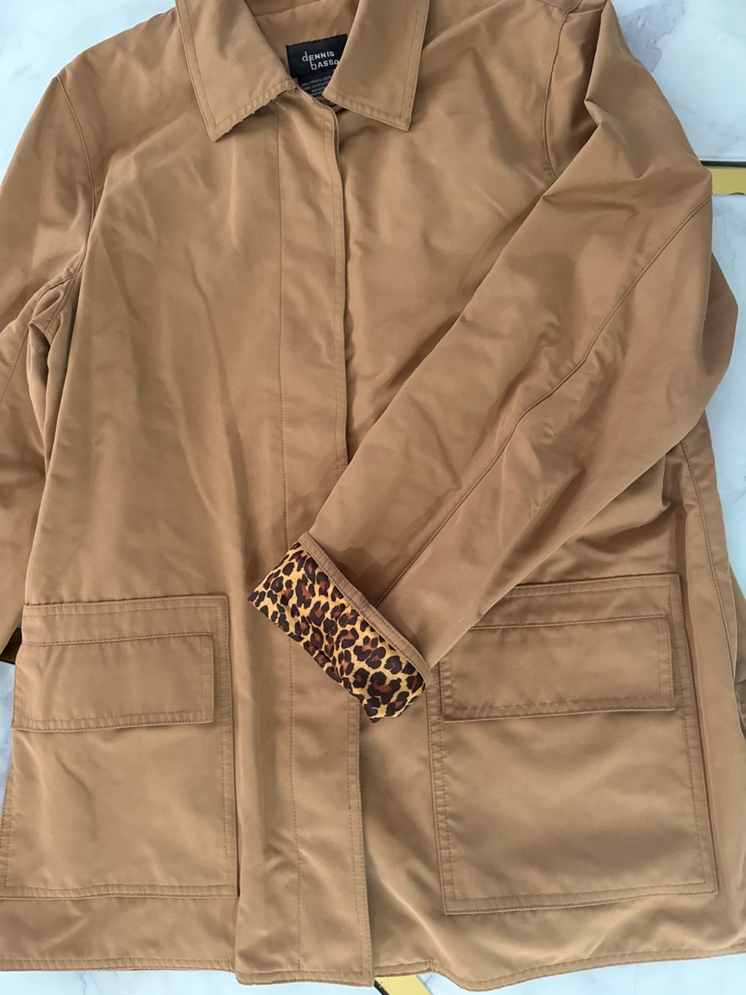 Here's a Dennis Basso jacket in a tan color! It's a size M and made with 100% polyester shell and lining. It has a unique leopard print cuff detail that adds a fun touch