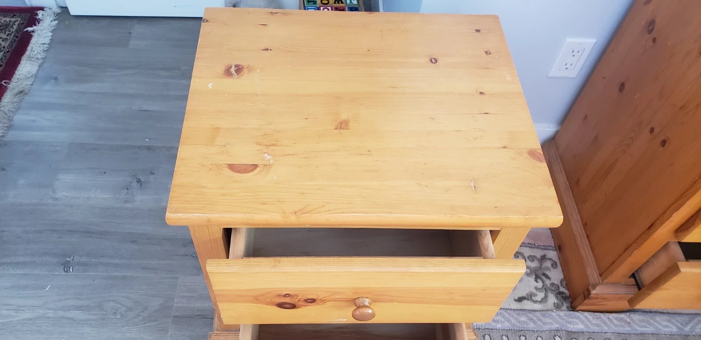 Selling a wooden nightstand with two drawers. It's in good condition and would be a great addition to any bedroom. It has a natural wood finish, perfect for adding a touch of warmth to your space 21 x 17 and 23" tall