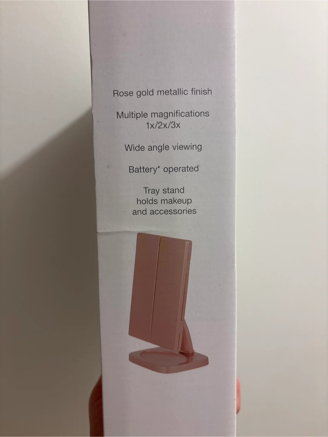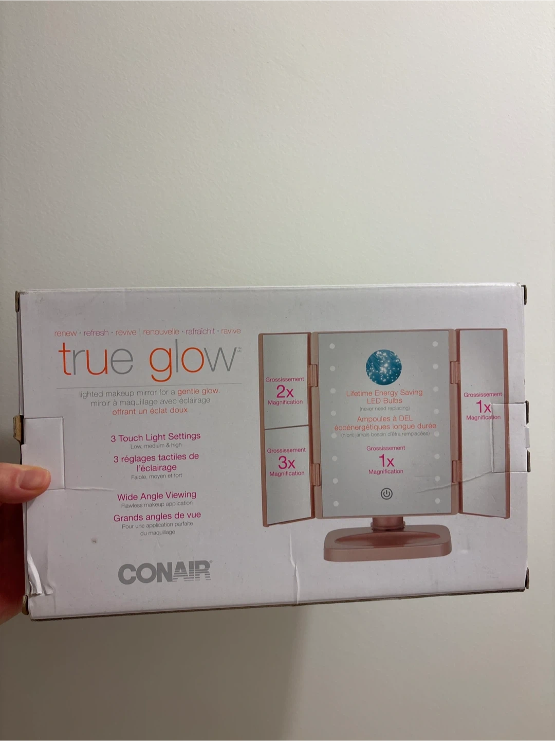 Selling a Conair True Glow lighted makeup mirror! It has a rose gold metallic finish and multiple magnifications (1x, 2x, and 3x). It also features wide angle viewing and a tray stand to hold makeup and accessories! The box is included