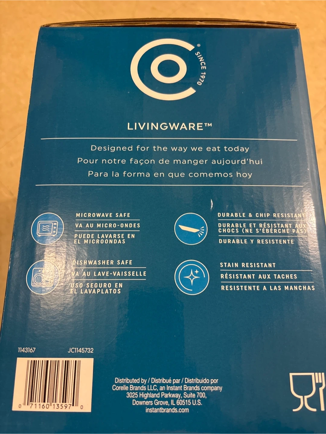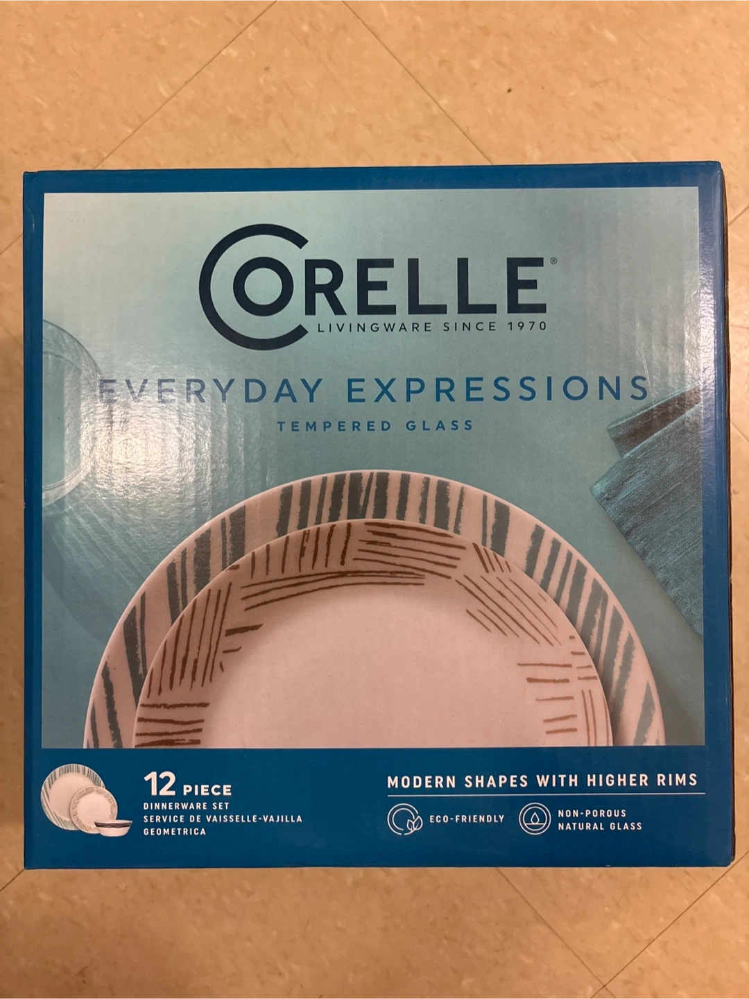 Selling a brand new Corelle Everyday Expressions 12-piece dinnerware set! This set features a stylish geometric design and is made of durable, chip-resistant tempered glass. It's also microwave and dishwasher safe. The set includes four 10.5-inch dinner plates, four 7.5-inch plates, and four 18-oz bowls. Box included