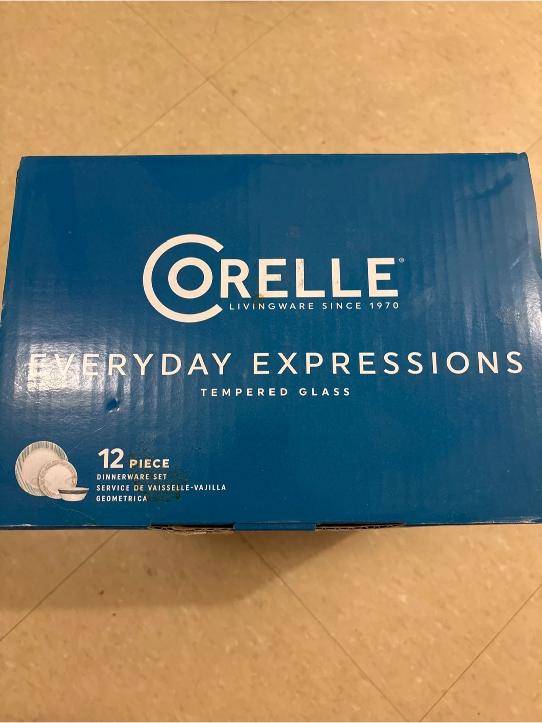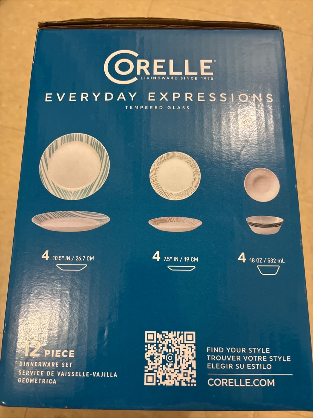 Selling a brand new Corelle Everyday Expressions 12-piece dinnerware set! This set features a stylish geometric design and is made of durable, chip-resistant tempered glass. It's also microwave and dishwasher safe. The set includes four 10.5-inch dinner plates, four 7.5-inch plates, and four 18-oz bowls. Box included