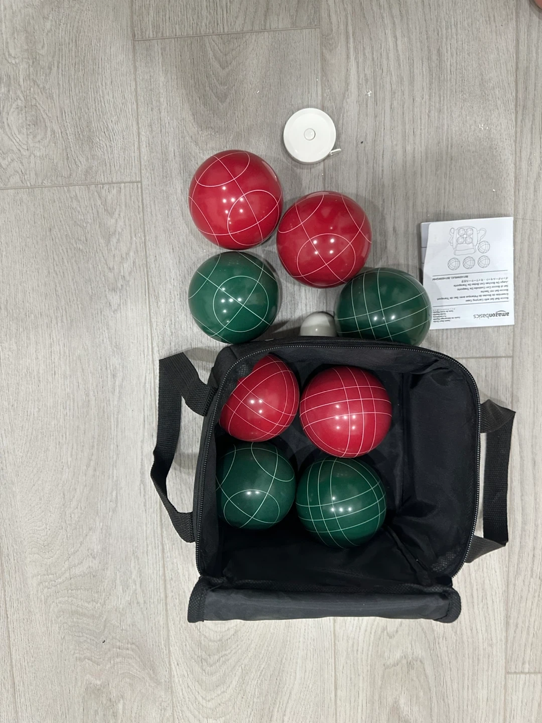 Bocce ball set by AmazonBasics with 8 bocce balls in red and green, and a white marker ball. It comes with a black carry case and instructions