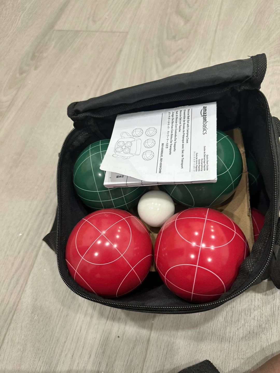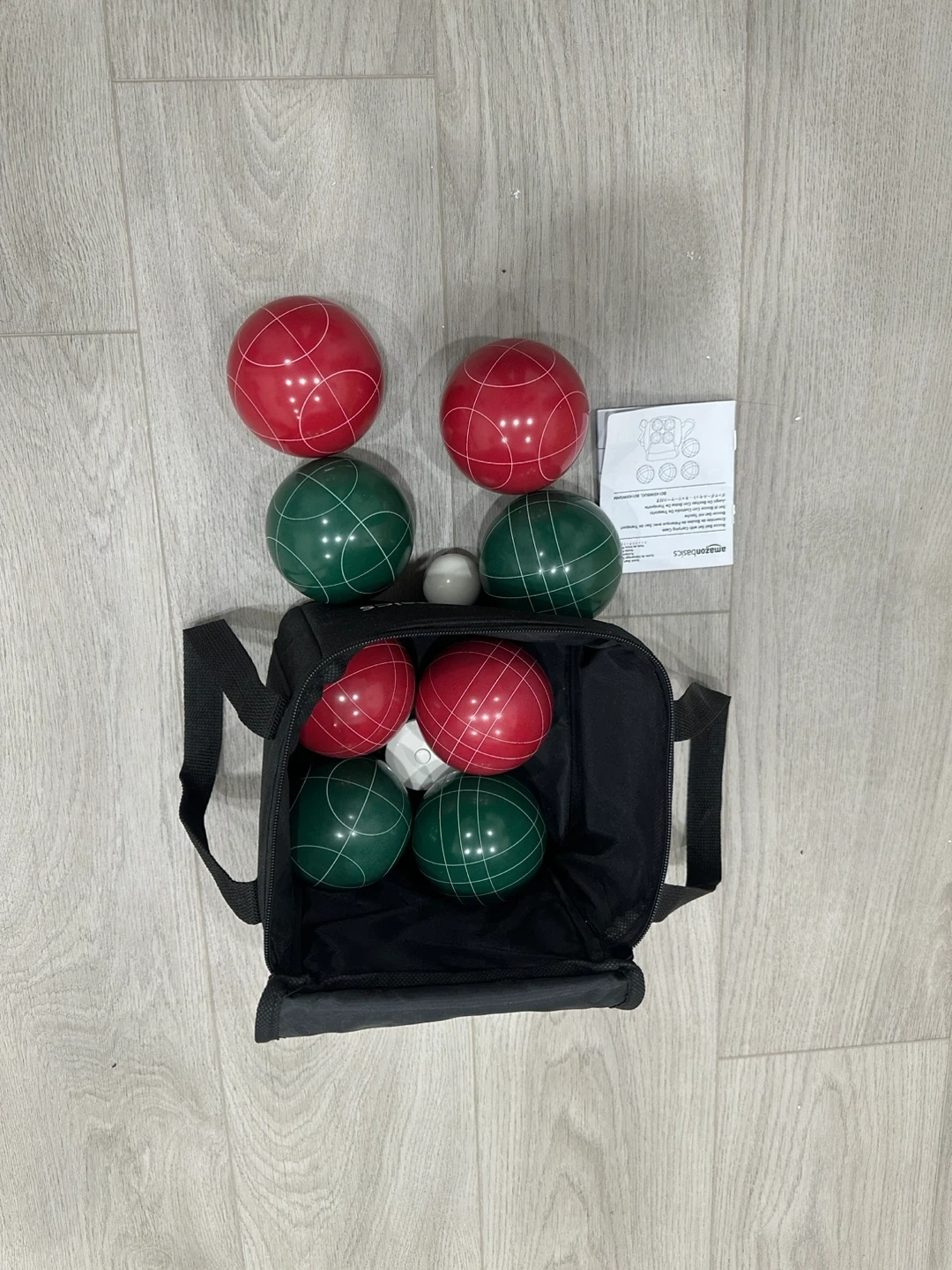 Bocce ball set by AmazonBasics with 8 bocce balls in red and green, and a white marker ball. It comes with a black carry case and instructions