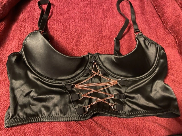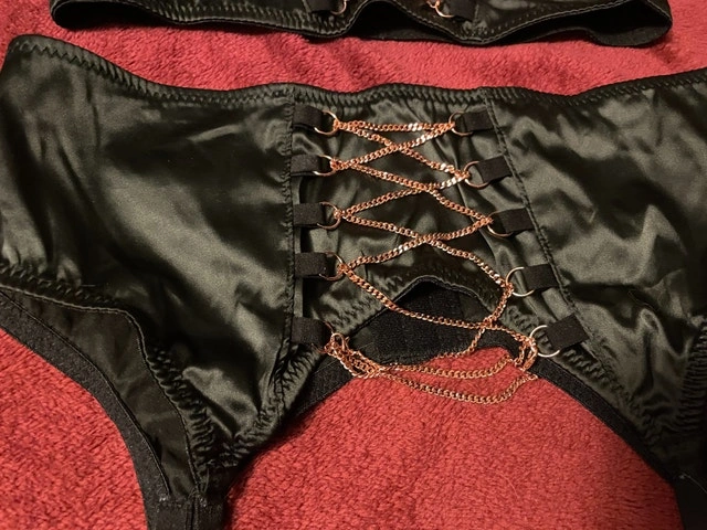 Abierta Fina Lingerie Set, with half-bra/half-cup look (your nops will be out) and garter. Rose gold chain and clasps. ~Very soft to the touch. New, never worn (it's not my size).