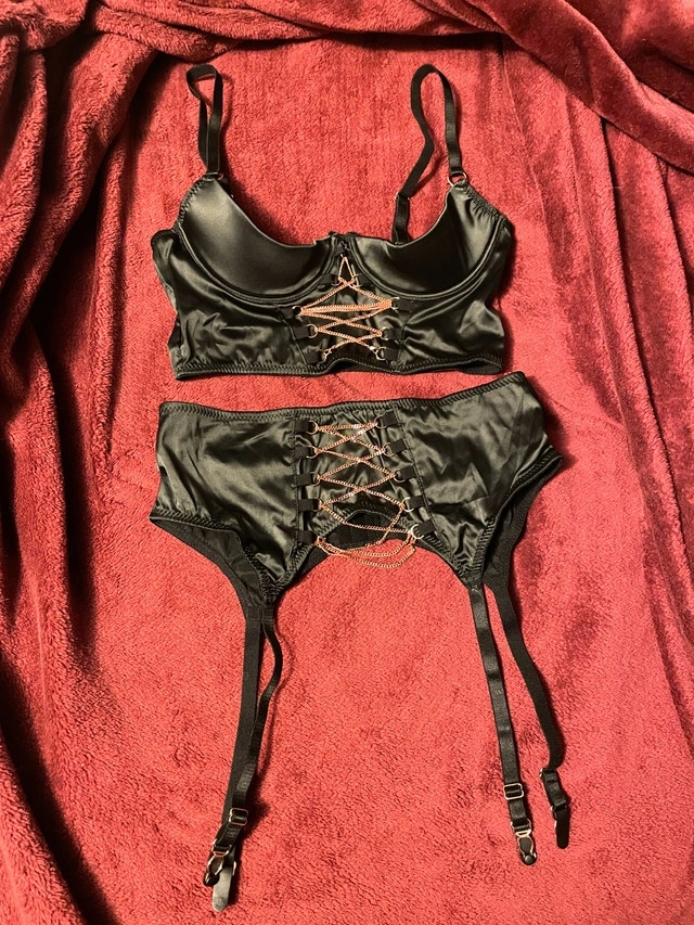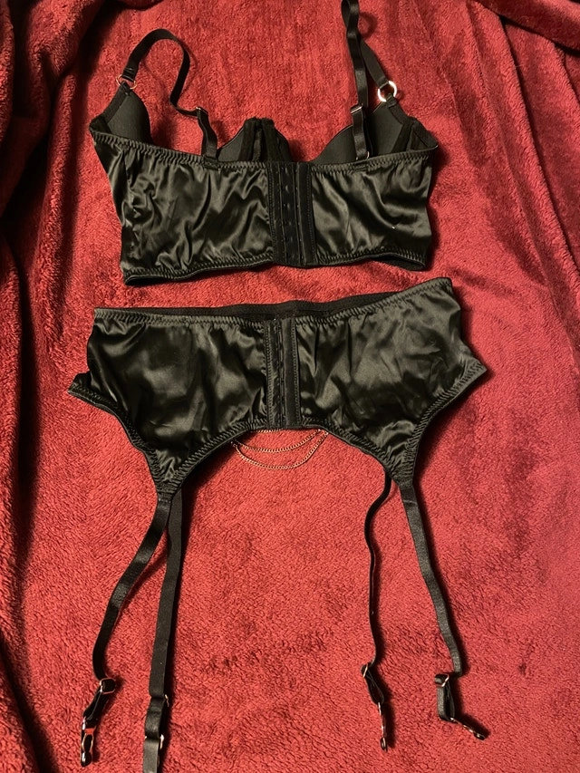 Abierta Fina Lingerie Set, with half-bra/half-cup look (your nops will be out) and garter. Rose gold chain and clasps. ~Very soft to the touch. New, never worn (it's not my size).