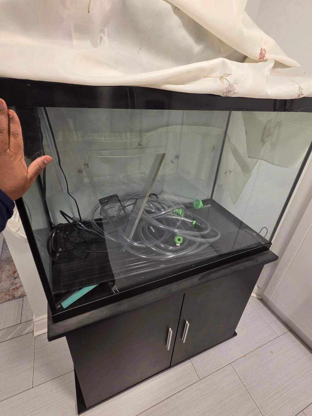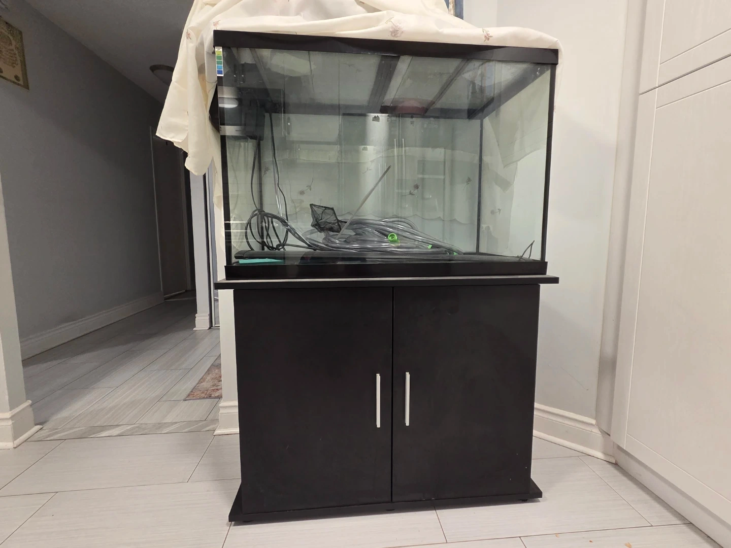 Selling a mildly used fish tank with a black cabinet attached. It comes with all the accessories shown in the pictures. Perfect for setting up your aquarium!