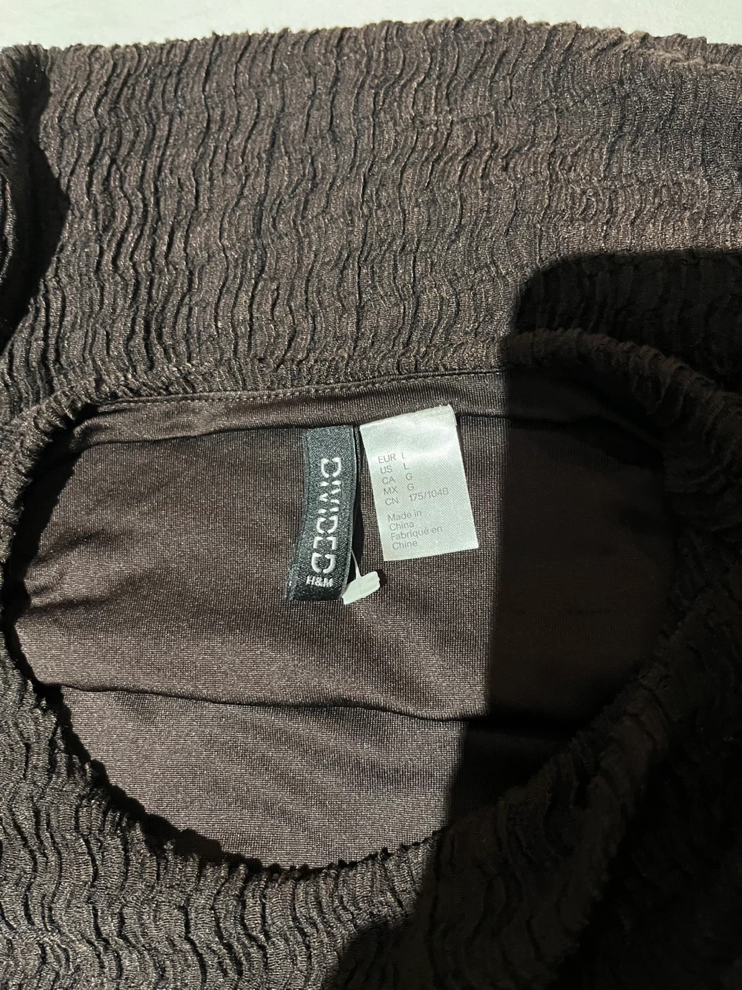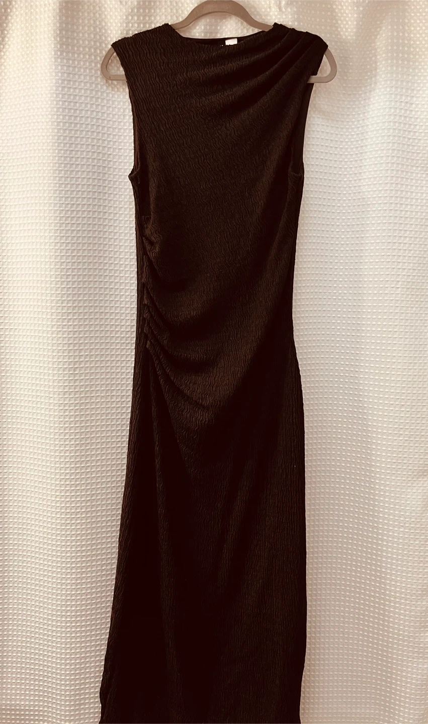 Selling a stylish dark brown sleeveless maxi dress from H&M's Divided line. It's a size large and made with a comfortable blend of 98% polyester and 6% elastane. Perfect for a casual day out or dressing up for an evening event! Has rouching on top part.