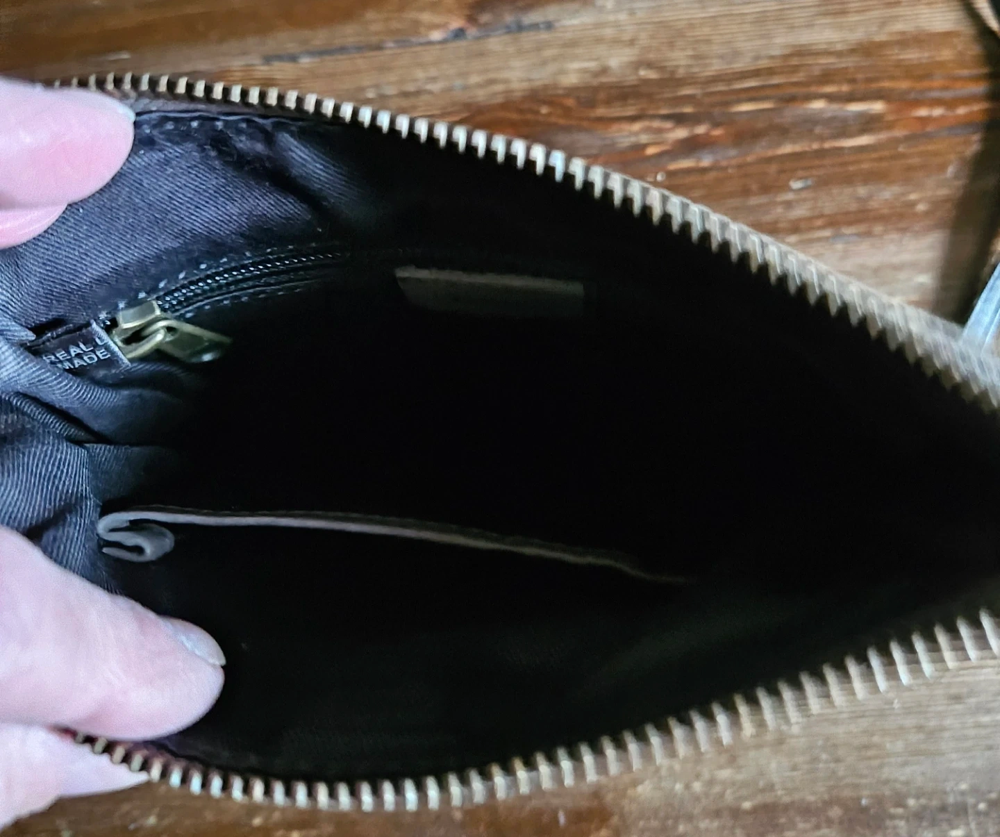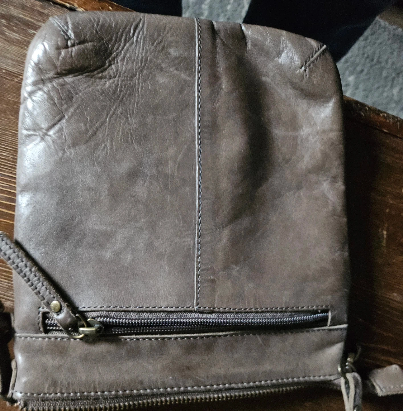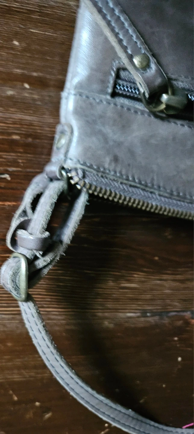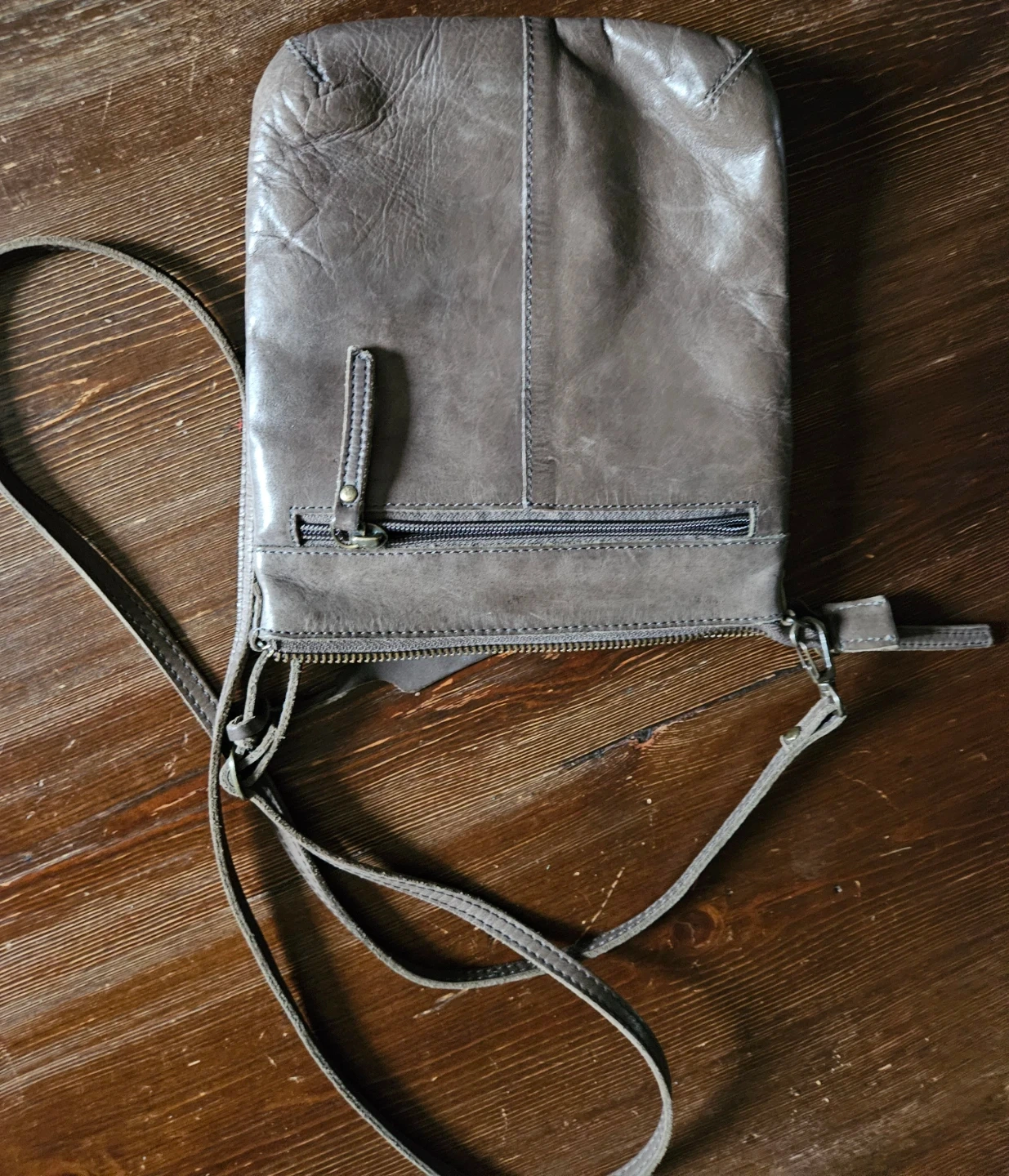 Here's a small new Cochor leather crossbody bag in grey. . It's approximately 10 inches tall and 11 inches wide. Great for everyday use! Numerous zippered pockets, and is adjustable. Pick up east mountain