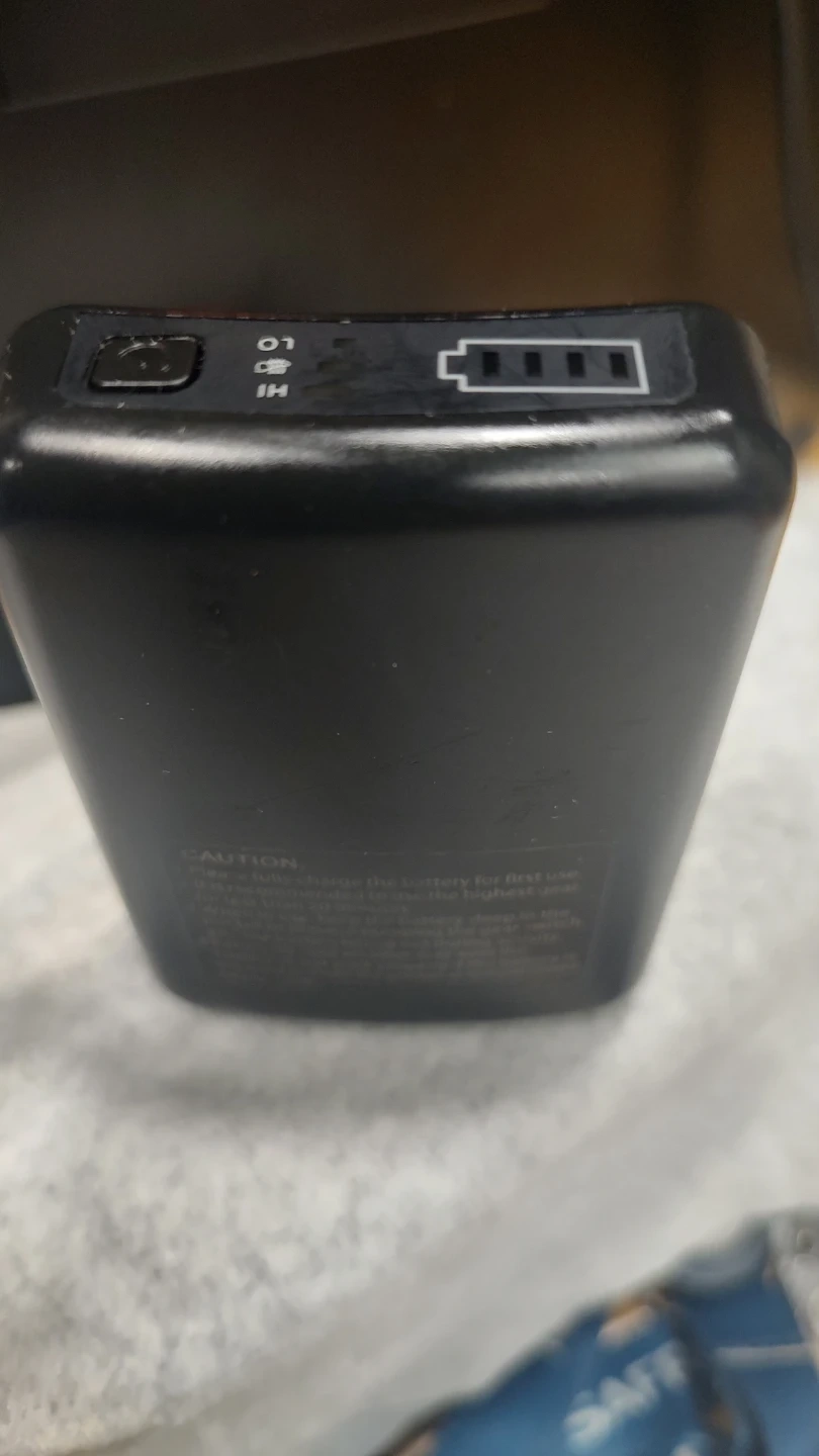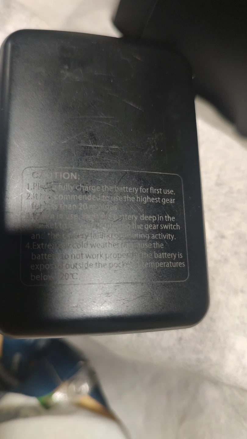 Selling a black battery pack. It has a low and high setting. Please fully charge the battery for first use. It is recommended to use the highest gear for less than 20 minutes at a time. When the battery is deep in the pocket and the battery fails during activity, extremely cold weather may cause the battery to not work properly if the battery is exposed outside the pocket at temperatures below 20°C
