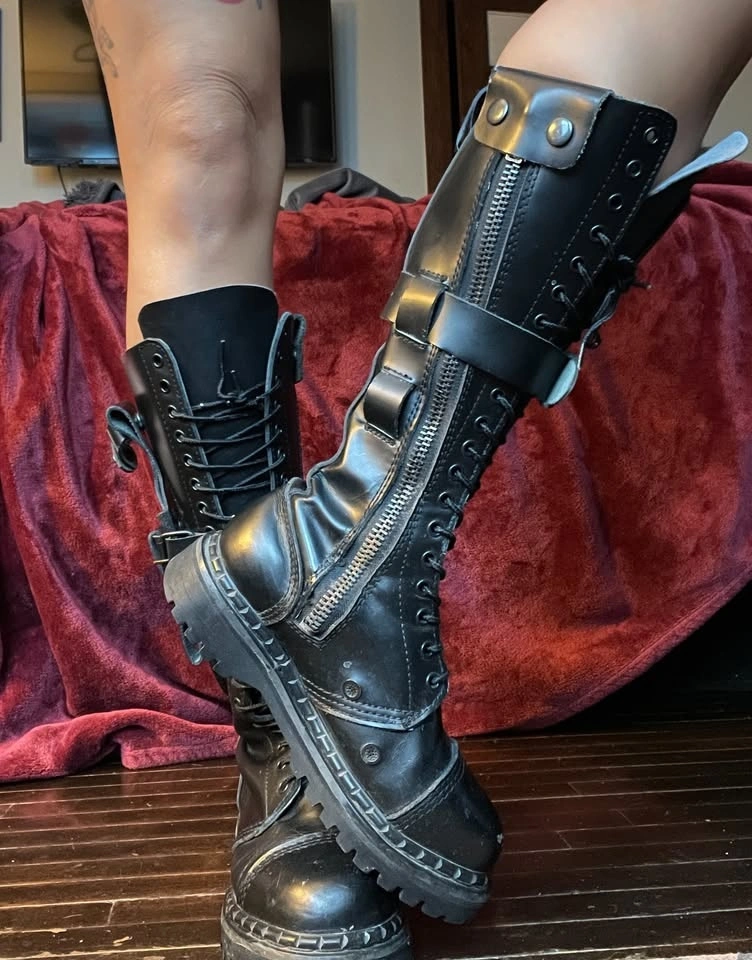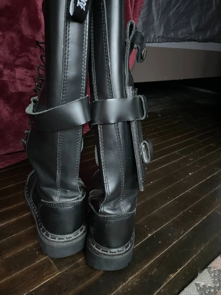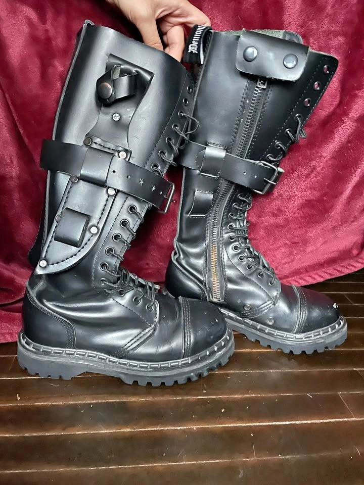 Knee high and steel-toed, they lace up and have side zippers for easier slip-on. There is an adjustable buckle strap on each boot, mostly for aesthetics. There are some flaws, like rusting at the bottom of zippers and nails holding the sole (I will see if I can get this off) and scuffs/marks on the leather.