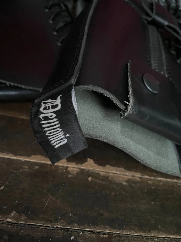 Demonia Predator-I black leather women's boots, size 8, discontinued, with knife sheath detail on right boot.