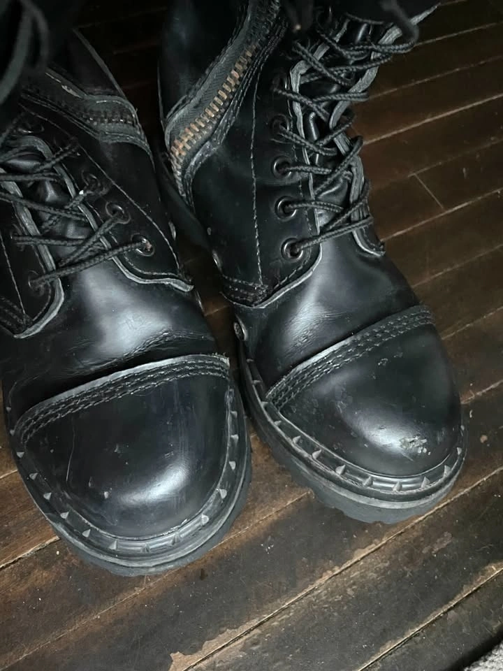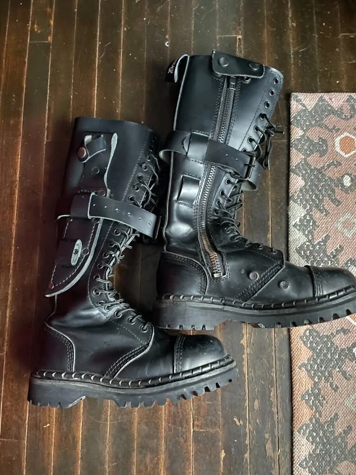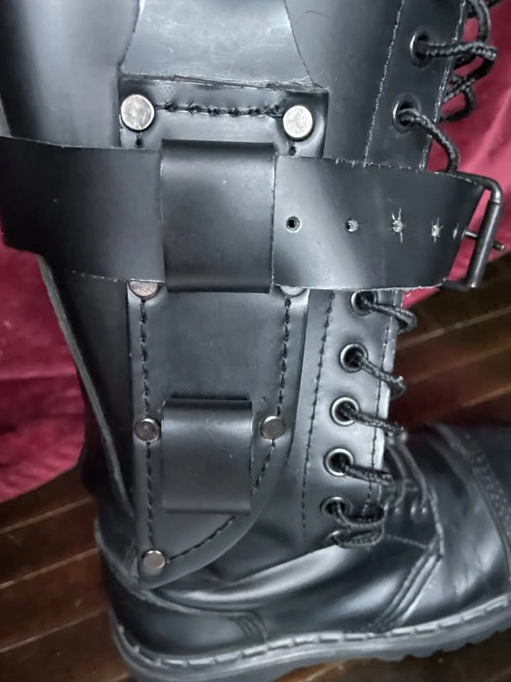 Knee high and steel-toed, they lace up and have side zippers for easier slip-on. There is an adjustable buckle strap on each boot, mostly for aesthetics. There are some flaws, like rusting at the bottom of zippers and nails holding the sole (I will see if I can get this off) and scuffs/marks on the leather.