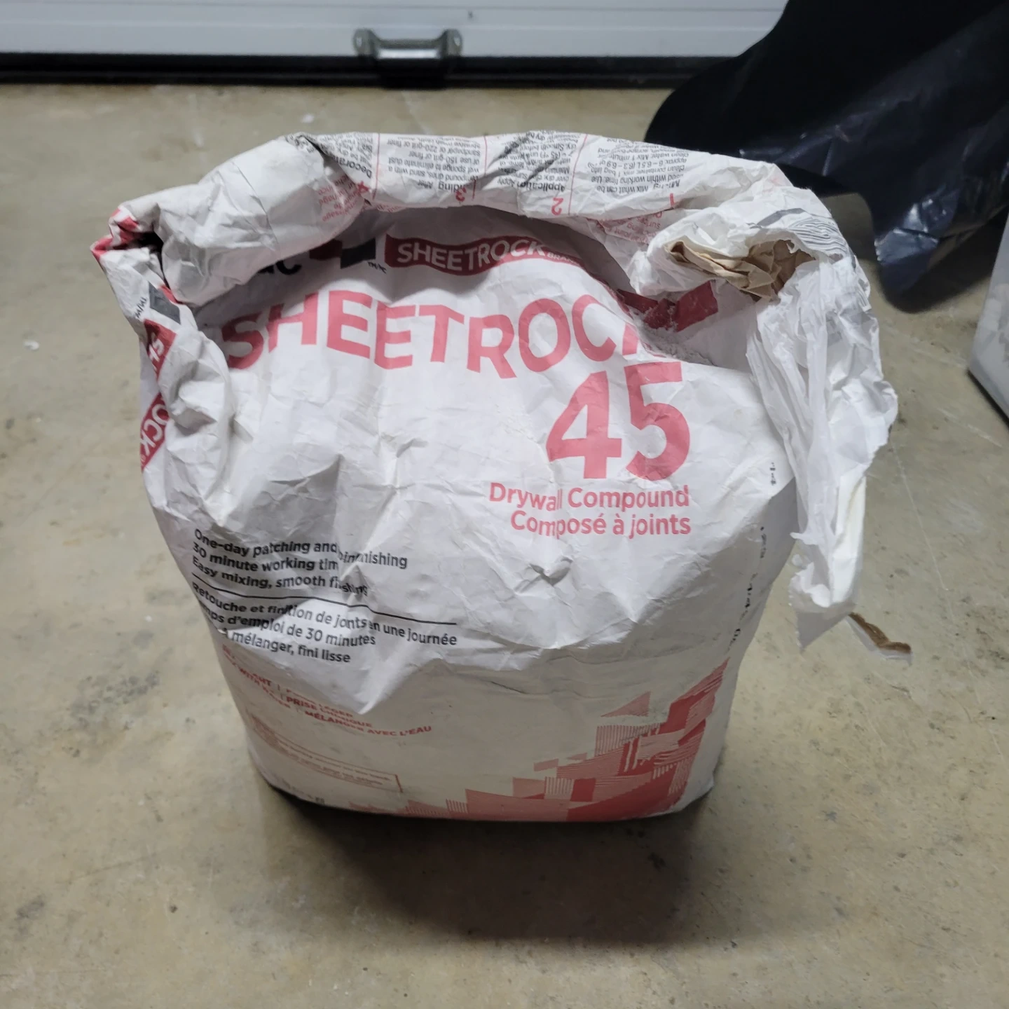 Selling a bag of Sheetrock 45 Drywall Compound. It's designed for one-day patching and finishing, with a 30-minute working time. Easy mixing and smooth finish!