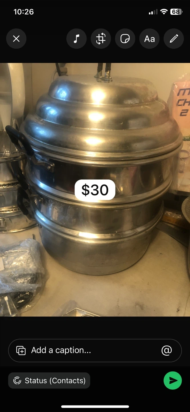 Selling a stainless steel steamer pot set. It has some signs of use, but it's still in good condition and ready for your kitchen! Also, there is a 14.5" diameter pot available without a lid.