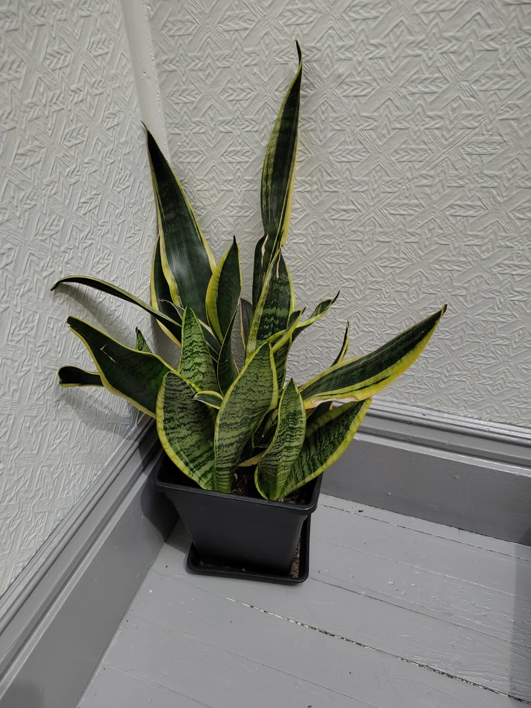 Selling a healthy snake plant in a black pot! It's a great indoor plant that's easy to care for and adds a nice touch of greenery to any room $25 each 5 more left