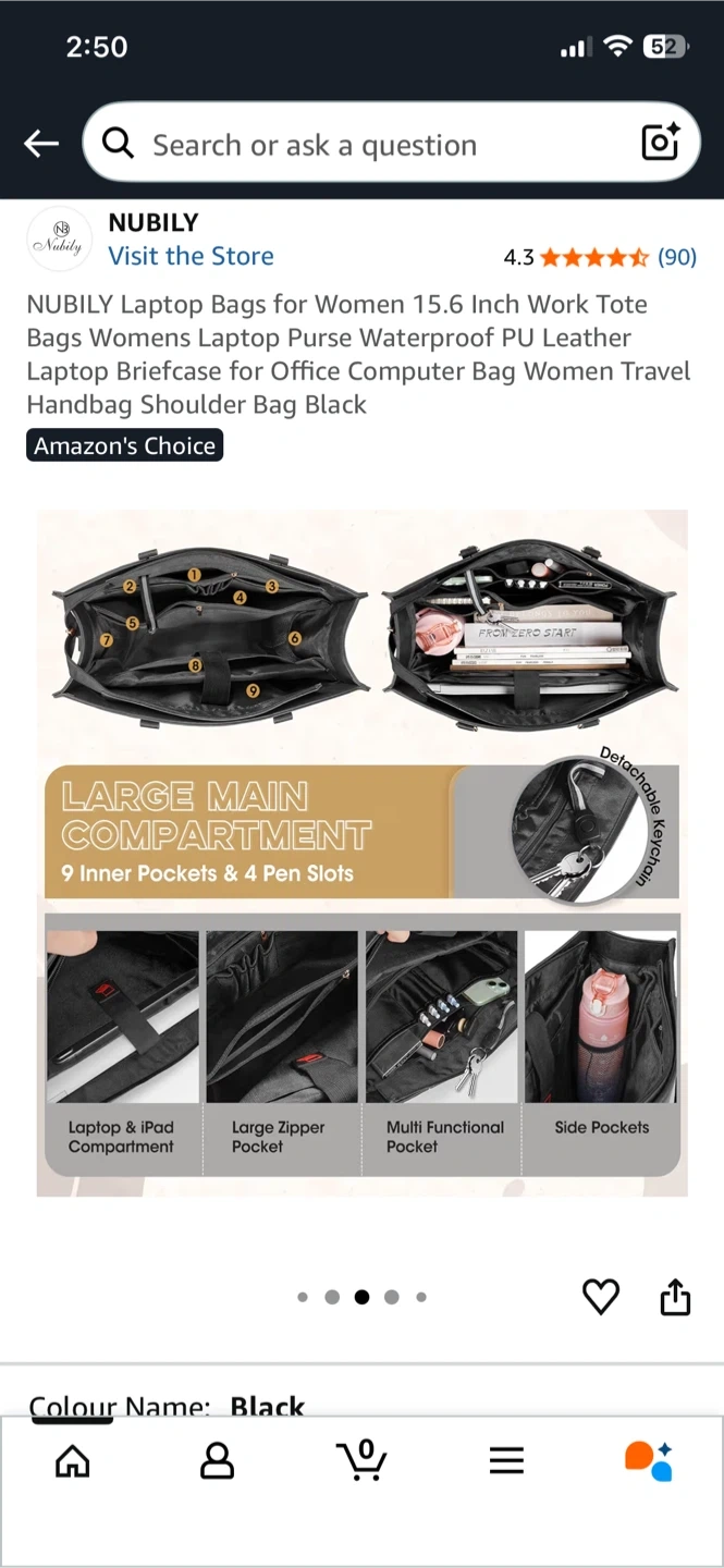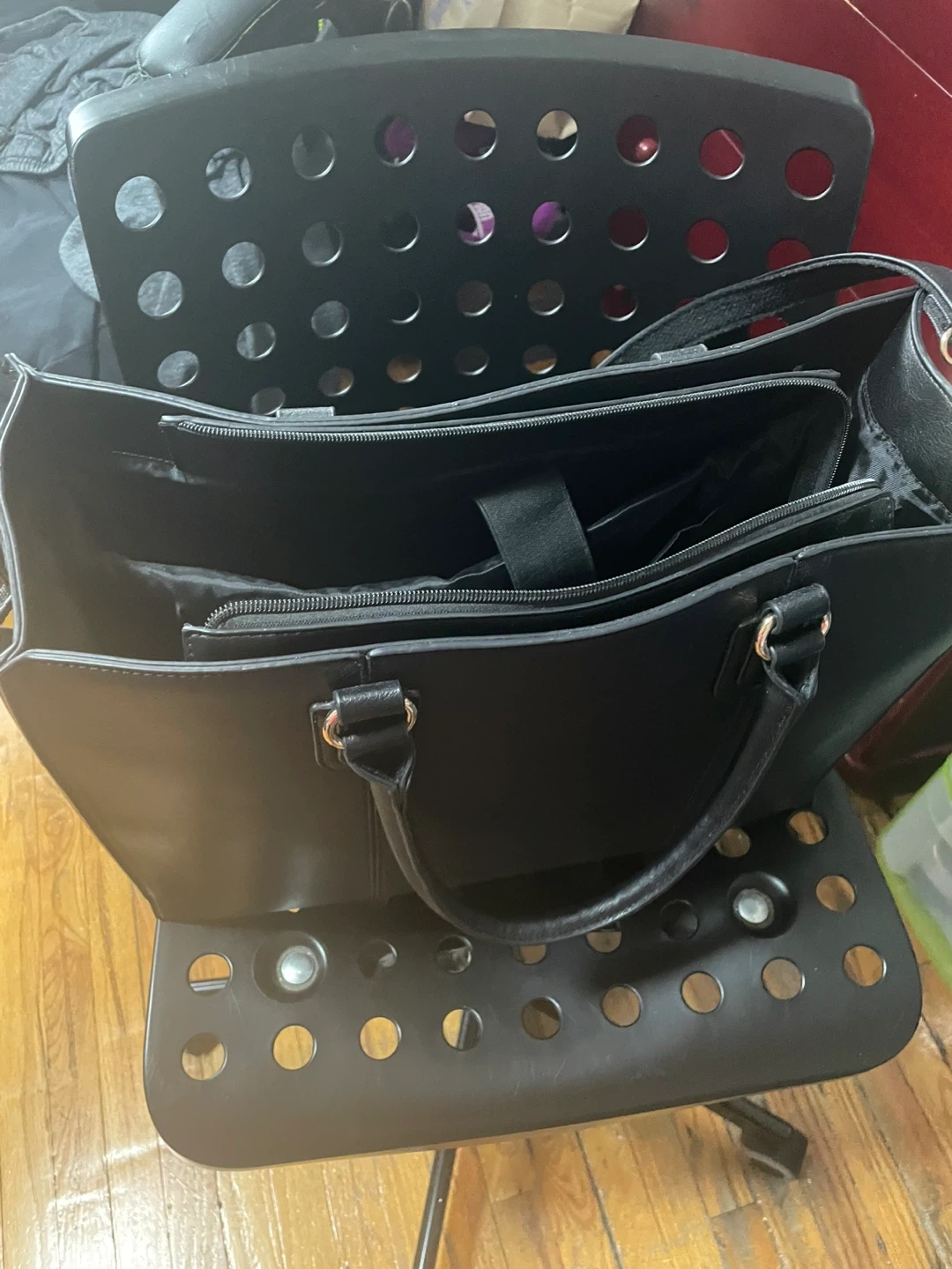 Selling a black tote bag. It features multiple compartments and zippers for organization. Perfect for work or everyday use!