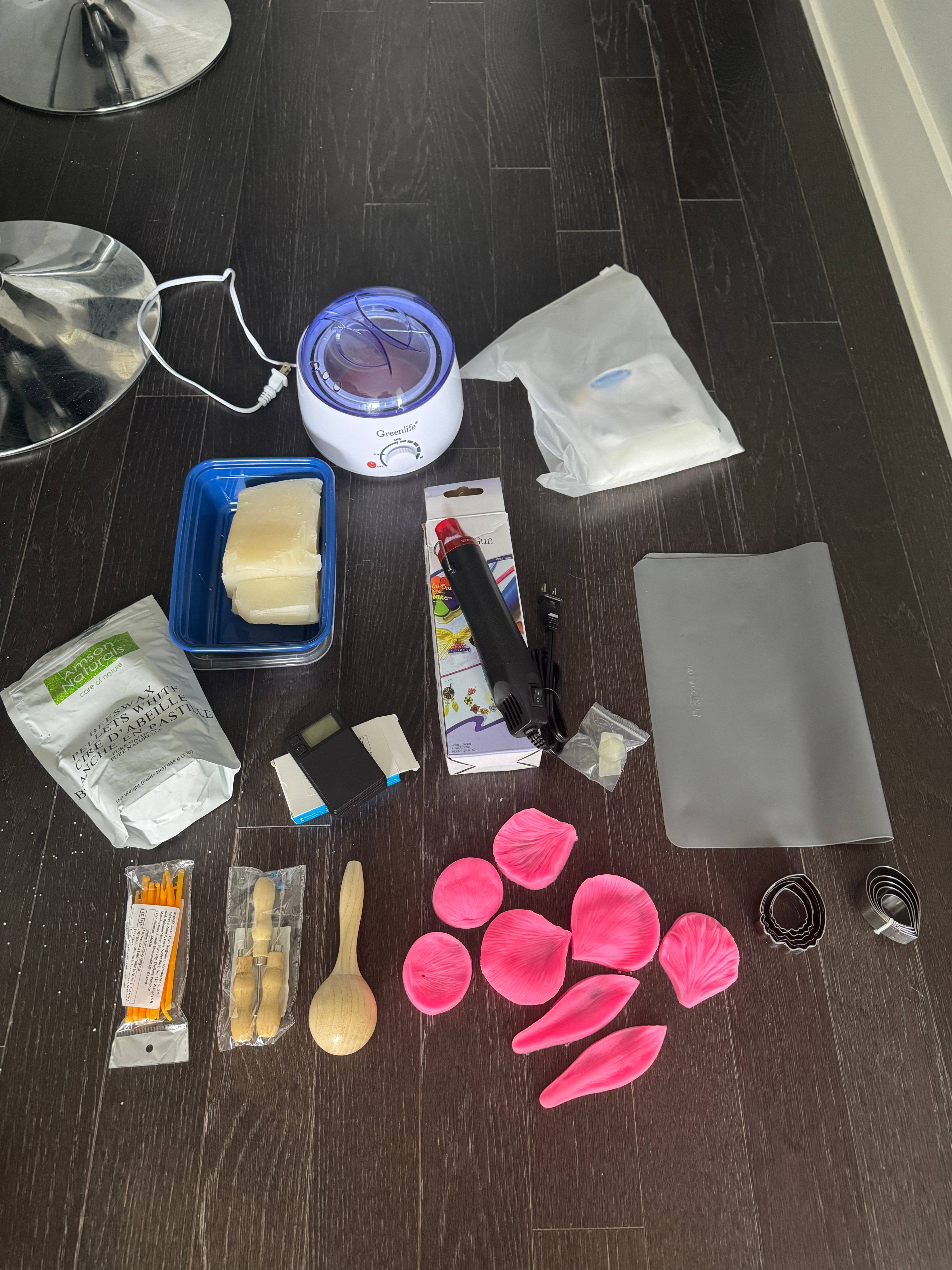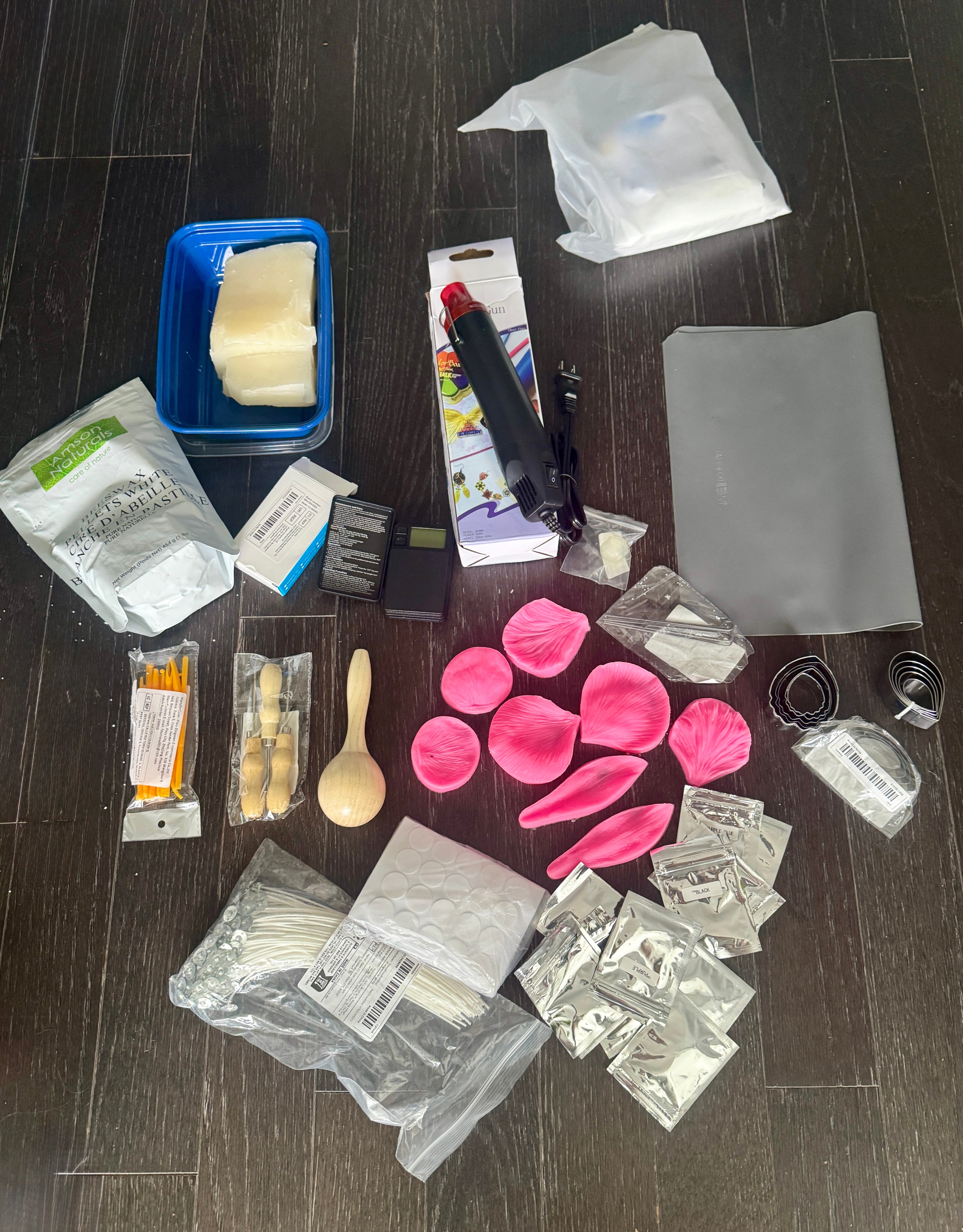 Candle Essentials 1. Candle Wick Holders – Metal wick centering tools for perfectly straight wicks. 2. Super Sticky Heat-Resistant Foam Wick Stickers (100pcs) – Plastic wax adhesive dots to secure wicks while pouring. 3. Wooden Sand Hammer – For shaping petals and detailed candle forms. 4. Candle Making Punch Tools (3pcs) – Round hole, cone, and crochet hand drills for silicone molds and candle detailing. 5. Candle Dye (12 colors) Wax & Heating Tools 1.300W Mini Heat Gun – For melting wax, resin, and other craft materials. 2.Professional Electric Wax Warmer & Heater – For soft paraffin or wax 3.Soft Paraffin – Ideal for candle making, and DIY projects. 4.White Beeswax Pellets (1lb / 454g) – 100% pure, natural, premium quality, suitable for candles, skincare, lip balm, lotions, and more. 5.Mould Master Stearin (250g) – For creating durable, high-quality candles. Precision Tools 1.Precision Pocket Scale (1000g x 0.1g) – Digital gram, food, jewelry, ounces/grains scale with backlit LCD for accurate measuring of wax or other materials. Molds & Silicone Tools 1. Multifunctional Silicone Craft Mat – Non-slip, non-stick surface. Perfect for wax, resin, or epoxy projects. 2. Clear Silicone Ball Mold (20mm) – For consistent, round wax shape. 3. Fondant Silicone Embossing Mold Set – Petals, leaves, rose, and lily textures for clay, fondant, or candle decorations. 4. Stainless Steel Flower Petal Mold – Durable molds for realistic flower designs in candles or cake decorating. 5. 14pcs Plastic Sculpting Tools – Wax carving and pottery tools for shaping and modeling polymer clay. Why This Kit is Perfect All-in-one solution for beginners and advanced crafters. Great for candles and craft projects.