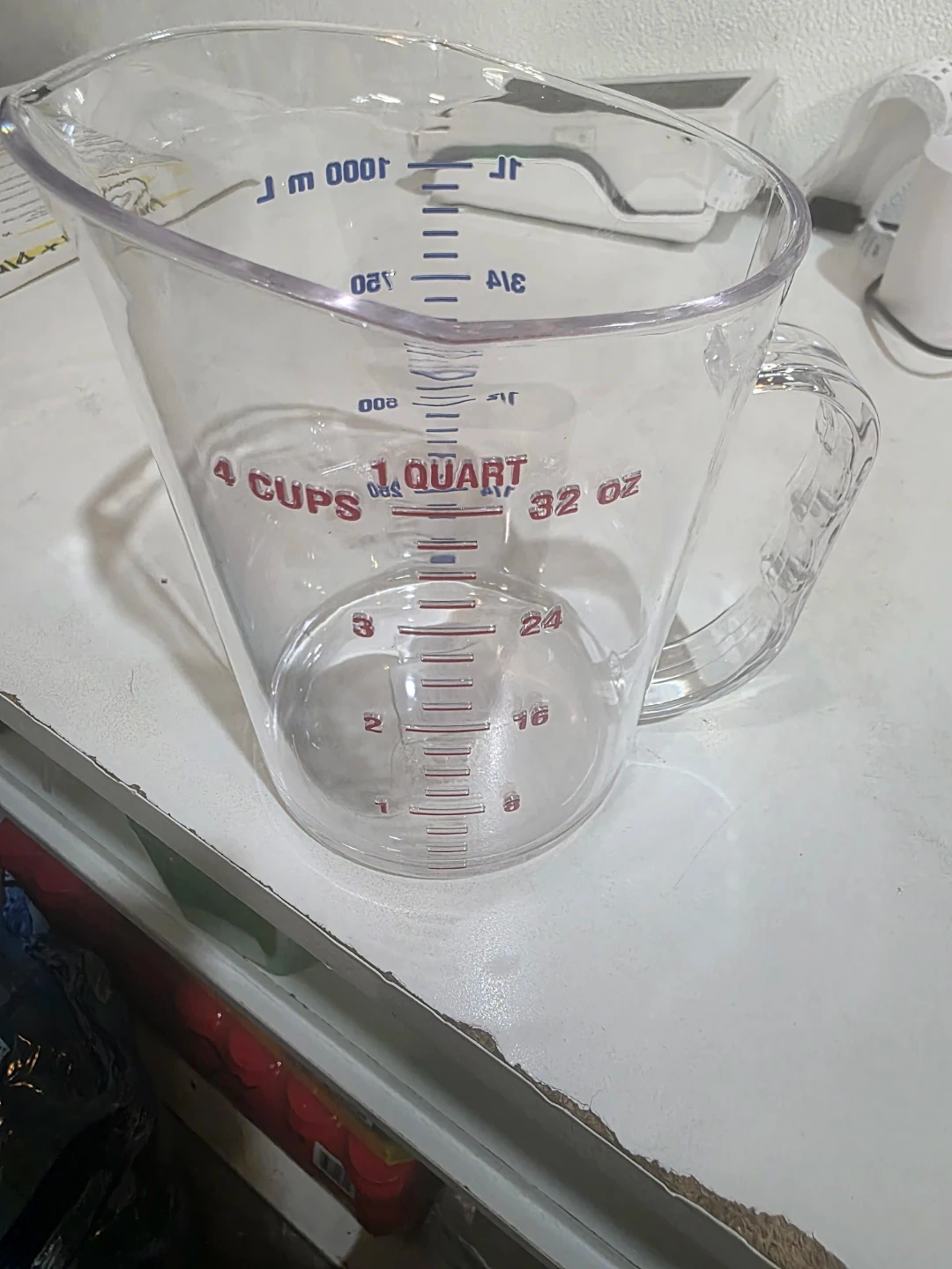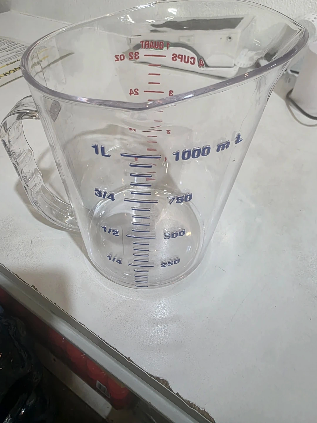 Clear plastic measuring cup, great for baking or cooking! It measures up to 4 cups, 1 quart, or 32 oz. It also has measurements in litres and millilitres.