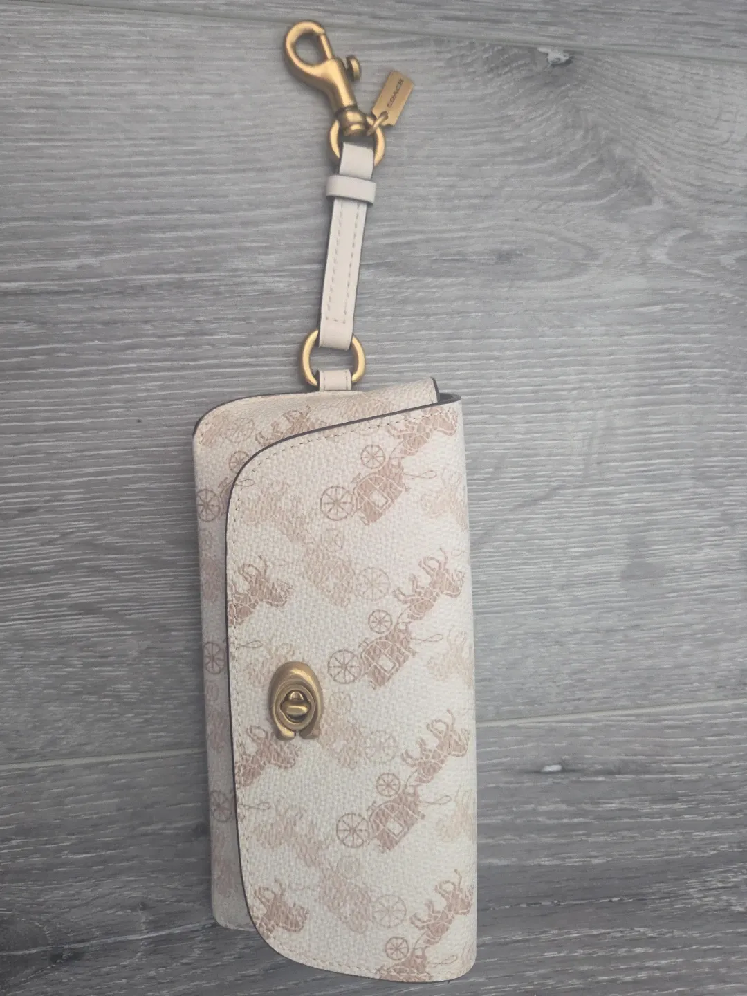 Selling a Coach glasses case with the horse and carriage print. It's in great used condition and perfect for carrying your essential cards. The white and pink colour combination is super cute!
