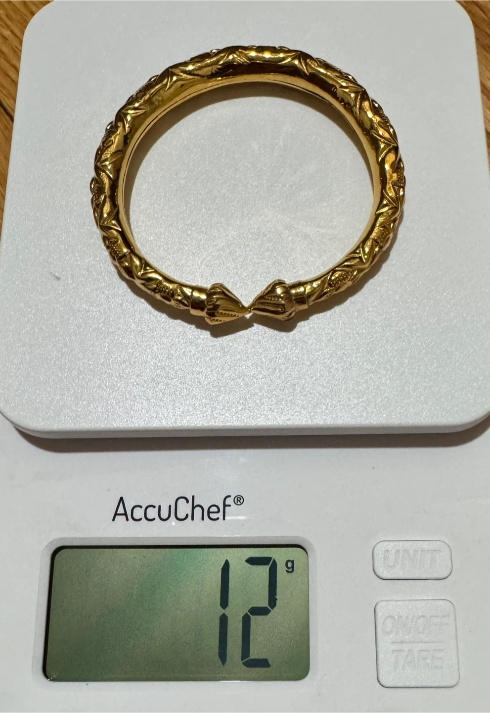 Beautiful gold bangle bracelet with intricate detailing. It weighs approximately 12 grams and has a diameter of about 2.5 inches. This bracelet is in great condition and would make a lovely addition to any jewelry collection