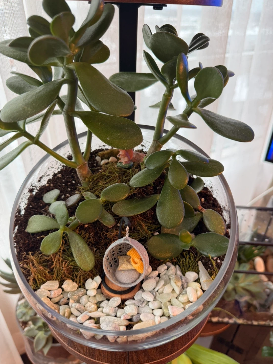 Selling a lovely jade plant terrarium! It's in great condition and would look amazing in any home. It features a glass bowl, soil, moss, white rocks, and a cute miniature chair.